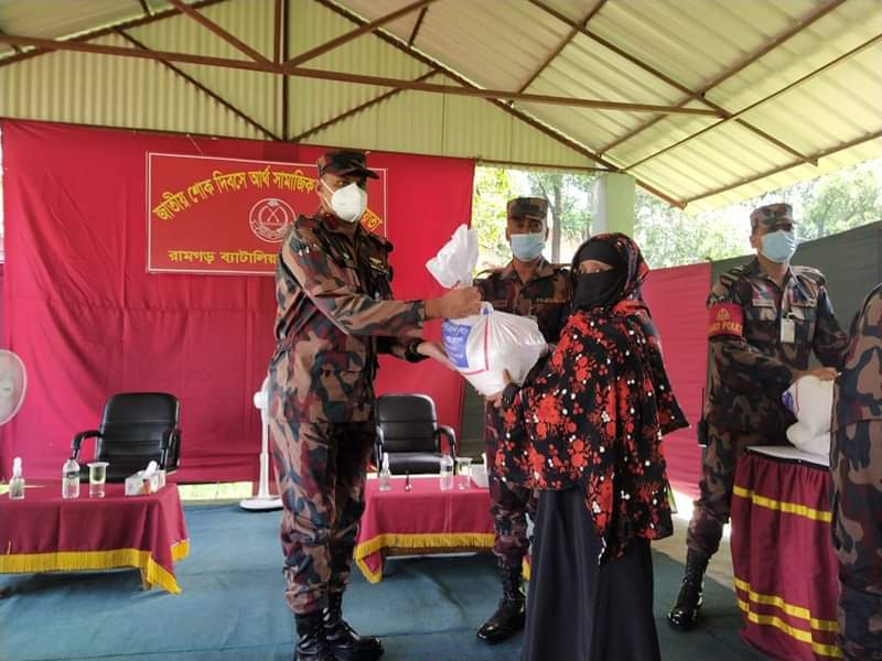 স্বাধীনতার স্থপতি বঙ্গবন্ধু শেখ মুজিবুর রহমান এর ৪৬তম শাহাদৎ বার্ষিকী ও জাতীয় শোক দিবস উপলক্ষ্যে খাগড়াছড়ির রামগড় উপজেলার ৫০ টি গরীব, দুঃস্থ, অসচ্ছল পরিবারের পাশে দাঁড়িয়েছে রামগড়স্থ ৪৩ বর্ডার গার্ড বাংলাদেশ (বিজিবি) এর অধিনায়ক লে: কর্ণেল আনোয়ারুল মাজহার পিএসসি।