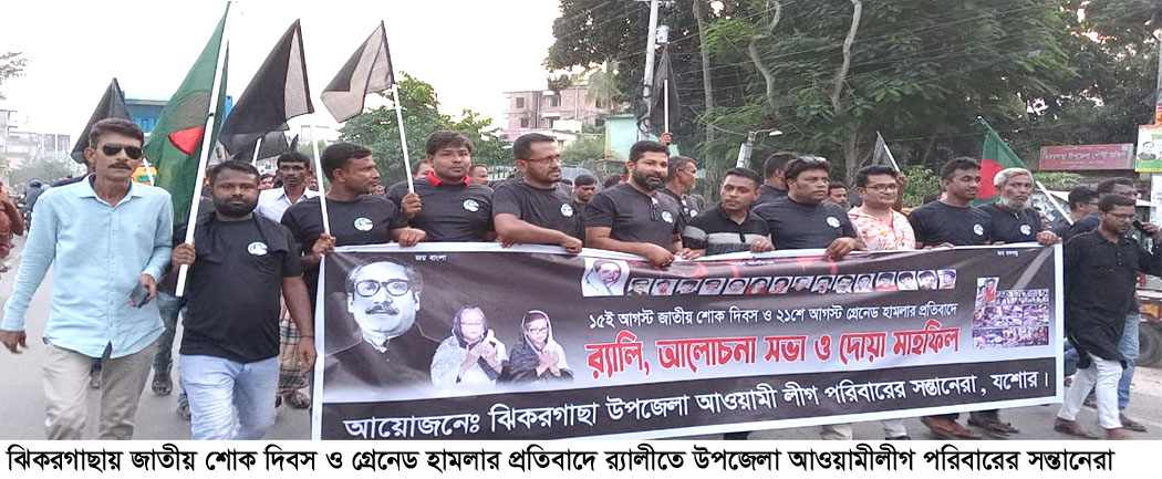 যশোরের ঝিকরগাছা উপজেলা আওয়ামীলীগ পরিবারের সন্তানদের আয়োজনে জাতীয় শোক দিবস ও ২০০৪ সালের গ্রেনেড হামলার প্রতিবাদে র্যালী, আলোচনা সভা ও দোয়া মাহফিল অনুষ্ঠিত হয়েছে। পৌর সদরের বোটঘাটের এই অনুষ্ঠানে ১৫ আগস্টে জাতির জনক বঙ্গবন্ধু শেখ মুজিবুর রহমান এঁর পরিবারের সদস্য ও ২১ আগস্ট গ্রেনেড হামলার মাস্টার মাইন্ডের খুঁজে বের করে অবিলম্বে ফাঁসি দেওয়ার আহবান জানিয়েছেন বক্তরা। এ সময় উপস্থিত ছিলেন বাংলাদেশ আওয়ামী যুবলীগের ঝিকরগাছা পৌর আহবায়ক কমিটির যুগ্ম আহবায়ক কামরুজ্জামান মিন্টু, উপজেলা তরুণ লীগের সভাপতি মনিরুল ইসলাম শিপলু, সাধারণ সম্পাদক বিপ্লব কুমার ধর, উপজেলা যুবলীগ নেতা তরিকুল ইসলাম, সোহেল হাওলাদার, সাজ্জাদুল ইসলাম সাজু, আব্দুস সালাম, সানি, প্রশান্ত কুমার কাঠু, শরিফুল ইসলাম, লাল্টু, বসু, রাহাসান, জিতু, শামীম, সিপন, স্বপন, তৌহিদুল ইসলাম মেননসহ আরো অনেকে।