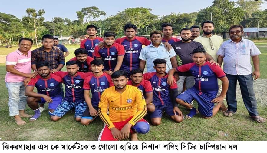 মহামারী করোনাকালীন সময়ে সারাদেশের সাথে তালমিলিয়ে সরকারের লকডাউন বন্ধ থাকার পর সকল প্রতিষ্ঠান খুলে দেওয়ার আনান্দে যশোরের ঝিকরগাছা পৌর সদরের ঐতিহ্যবাহী দুটি মার্কেটের মধ্যে ফুটবল খেলার আয়োজ করা হয়। শুক্রবার বিকালের খেলায় ঐতিহ্যবাহী এস.কে সুপার মার্কেটকে ০-৩ গোলো হারিয়ে ঐতিহ্যবাহী নিশানা শপিং সিটি চাম্পিয়ান হয়েছে। ঐতিহ্যবাহী নিশানা শপিং সিটির পক্ষে ১ম পর্বে ১টা গোল করেন আশা এবং ২য় পর্বে ২টা শুভ। এসময় উপস্থিত ছিলেন, ঐতিহ্যবাহী নিশানা শপিং সিটির সভাপতি মোঃ মাসুদুর রহমান মাসুদ, সাধারণ সম্পাদক ফয়সাল আরমান, এস.কে সুপরি মার্কেটের সহ সাধারণ সম্পাদক মেহেদী হাসান মিন্টু প্রমুখ।