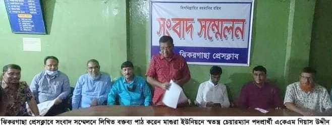 আসন্ন ইউনিয়ন পরিষদ নির্বাচনে যশোরের ঝিকরগাছা উপজেলার ২নং মাগুরা ইউনিয়নে স্বতন্ত্র চেয়ারম্যান পদপ্রার্থী একেএম গিয়াস উদ্দীন আওয়ামীলীগের আদর্শের প্রতি আস্থা রেখে প্রেসক্লাবে সংবাদ সম্মেলন করে নির্বাচন থেকে সরে দাঁড়ানোর ঘোষনা দিয়েছেন। একই সাথে তিনি বাংলাদেশ আওয়ামীলীগের নৌকার মনোনিত প্রার্থী আব্দুর রাজ্জাক কে সমর্থন করে সকলকে নৌকায় ভোট দেয়ার আহবান জানান। বৃহস্পতিবার দুপুরের এই সংবাদ সম্মেলনে উপস্থিত ছিলেন, উপজেলা আওয়ামীলীগের সিনিয়র সহ-সভাপতি ও পৌর মেয়র আলহাজ্ব মোস্তফা আনোয়ার পাশা জামাল, উপজেলা আওয়ামীলীগের সহ-সভাপতি চৌধুরী রজমান শরীফ বাদশা, সাবেক উপজেলা ছাত্রলীগের সভাপতি রফিকুল ইসলাম বাপ্পি, উপজেলা পরিষদের ভাইস চেয়ারম্যান সেলিম রেজা, আওয়ামীলীগের নৌকার মনোনিত প্রার্থী আব্দুর রাজ্জাক, প্রেসক্লাবের সভাপতি এমামুল হাসান সবুজ, সাধারণ সম্পাদক সৈয়দ ইমরানুর রশীদ, উপজেলা স্বেচ্ছাসেবক লীগের আহ্বায়ক কমিটির আহ্বায়ক আবুল কালাম আজাদ, উপজেলা ছাত্রলীগের সভাপতি এনামুল হাবিব শিবলু সহ আরও অনেকে।
