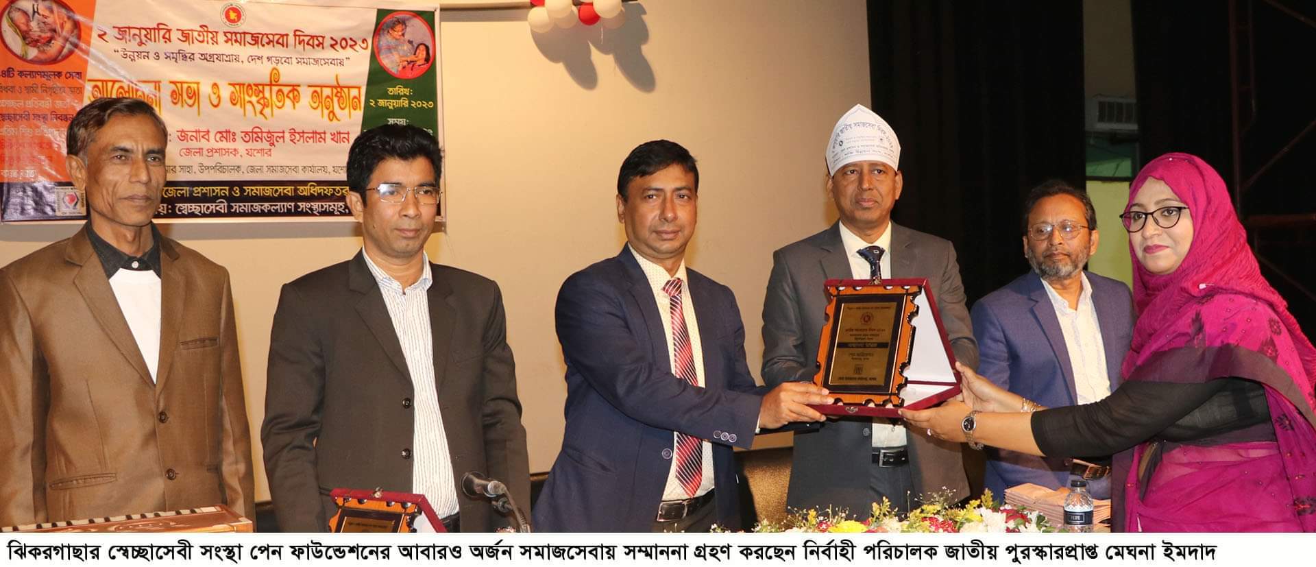 যশোরের জেলা প্রশাসন ও জেলা সমাসসেবা কার্যালয়ের আয়োজনে জাতীয় সমাজসেবা দিবস উপলক্ষ্যে র্যালি, অলোচনা সভা, সাংস্কৃতিক অনুষ্ঠান ও সম্মাননা প্রদান অনুষ্ঠান থেকে সমাজসেবায় অনন্য অবদানের স্বীতৃতি স্বরূপ ঝিকরগাছার স্বেচ্ছাসেবী সংস্থা পেন ফাউন্ডেশনের আবারও আর্জন বিশেষ সম্মাননা স্মারক প্রদান করা হয়েছে। অনুষ্ঠানের প্রধান অতিথি যশোর স্থানীয় সরকার বিভাগের উপ-পরিচালক (উপসচিব) মোঃ হুসাইন শওকত’র হাত থেকে সম্মাননা ক্রেস্ট নেন পেন ফাউন্ডেশনের নির্বাহী পরিচালক জাতীয় পুরস্কারপ্রাপ্ত মেঘনা ইমদাদ।
