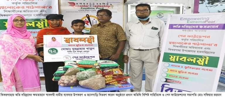যশোরের ঝিকরগাছায় অতি দরিদ্রদের ক্ষমতায়ন কর্মসূচীর আওতায় পেন ফাউন্ডেশন কর্তৃক পরিচালিত স্বপ্নলোকের পাঠশালা’র শিক্ষার্থীদের অভিভাবক এবং উপজেলার ২০ জনের হতদরিদ্রদের মাঝে “স্বাবলম্বী” নামীয় ব্যবসার উপকরণ (বাদাম,ঝুরিভাজা, ঝাল মুড়ির ব্যবসা) ও ভ্যানগাড়ি বিতরণ করা হয়েছে। বুধবার বিকাল সাড়ে ৪টায় পেন ফাউন্ডেশনের প্রধান কার্যালয়ে অনুষ্ঠানে প্রধান অতিথি ছিলেন বিশিষ্ট সাহিত্যিক ও পেন ফাউন্ডেশনের সভাপতি মোঃ সফিয়ার রহমান। পেন ফাউন্ডেশনের নির্বাহী পরিচালক মেঘনা ইমদাদ’র সভাপতিতেত্ব উপস্থিত ছিলেন সাবেক উপজেলা সমবায় কর্মকর্তা এবিএম আক্তারুজ্জামান, পেন ফাউন্ডেশনের প্রধান উপদেষ্টা ইমদাদুল হক ইমদাদ, পেন ফাউন্ডেশনের সমন্বয়কারী রিজন বিশ্বাস, এসএম জাহাঙ্গীর, সাফওয়ান ইবনে ইমদাদ প্রমুখ।