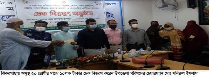 যশোরের ঝিকরগাছা উপজেলার সমাজেসবা অধিদফতর কতৃর্ক ক্যান্সার, কিডনি, লিভার সিরোসিস, ষ্ট্রোক প্যারালাইজড, থ্যলাসামিয়া রোগে আক্রান্ত ২০ জন অসুস্থ রোগীর মাঝে ১০লক্ষ টকার চেক বিতরণ করেন অনুষ্ঠানের প্রধান অতিথি উপজেলা পরিষদের চেয়ারম্যান মোঃ মনিরুল ইসলাম। উপজেলা পরিষদের ভিডিও কনফারেন্স রুমে উপজেলা নির্বাহী অফিসার মোঃ মাহবুবুল হক'র সভাপতিত্বে ও উপজেলা সমাজসেবা অফিসার এএফএম ওয়াহিদুজ্জামান’র সঞ্চালনায় বিশেষ অতিথি ছিলেন, উপজেলা পরিষদের মহিলা ভাইস চেয়ারম্যান লুবনা তাক্ষী, উপজেলা স্বাস্থ্য ও পরিবার পরিকল্পনা অফিসার ডাঃ রাশিদুল আলম, থানার অফিসার ইনচার্জ মোঃ আব্দুর রাজ্জাক, ঝিকরগাছা সরকারি এমএল মডেল হাই স্কুলের প্রধান শিক্ষক মোঃ মোস্তাফিজুর রহমান আজাদ প্রমুখ।