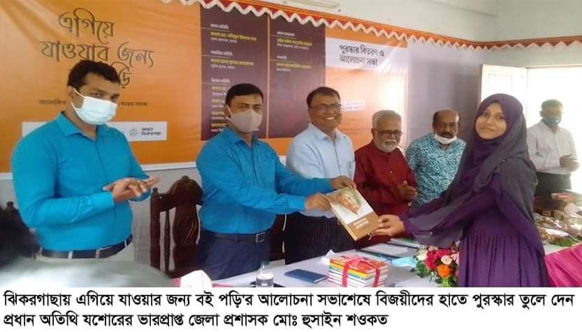 যশোরের ঝিকরগাছায় এগিয়ে যাওয়ার জন্য বই পড়ি'র পুরস্কার বিতরণ ও আলোচনা সভা অনুষ্ঠিত হয়েছে। অর্পন-দর্পণ স্মৃতি ফাউন্ডেশনের আয়োজনে ও জাগ্রত ঝিকরগাছা সংগঠনের সহযোগিতায় শনিবার সকালে ঝিকরগাছা দারুল উলুম কামিল মাদ্রাসা মিলনায়তনে লেখক রাশেদুল ইসলামের ‘লকডাউনে আমার মা’ নামক বইয়ের উপর আলোচনা করেন, অনুষ্ঠানের প্রধান অতিথি যশোরের ভারপ্রাপ্ত জেলা প্রশাসক মোঃ হুসাইন শওকত। তিনি তার বক্তব্যে বলেন, মানুষের অসম্ভব বলে কিছুই নেই, তারই বাস্তব প্রমাণ দিলো আমার জেলার মধ্যে ঝিকরগাছা উপজেলার শিক্ষার্থীরা। এই লকডাউনের মধ্যে আমাদের শিক্ষার্থীরা তাদের পাঠ্যপুস্তকের পাশাপাশি, পাঠ্যপুস্তকের বাহিরে ‘লকডাউন আমার মা’ নামক আরেকটি পুস্তক পাঠ্যকরে এগিয়ে যাওয়ার জন্য বই পড়ি প্রতিযোগিতায় অংশগ্রহণের মাধ্যমে আজ তারা পুরস্কার প্রাপ্ত হয়েছে। তাদেরসহ সকলকে আমার জেলা পরিষদের পক্ষ থেকে আন্তরিক শুভেচ্ছা ও অভিনন্দন জানায়।