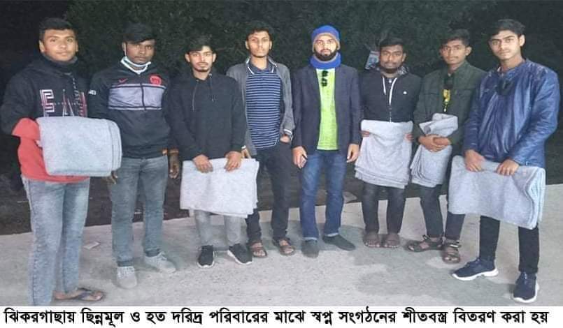 যশোরের ঝিকরগাছায় উপজেলার মধ্যে বাছাই করা ছিন্নমূল ও হত দরিদ্র পরিবারের মাঝে স্বপ্ন সংগঠনের মাধ্যমে শীত বস্ত্র বিতরণ করা হয়েছে। বুধবার (২৬ জানুয়ারী) রাত ১০টার পরে রাতের আধারে ঝিকরগাছা বাজার সহ বিভিন্ন এলাকায় ছিন্নমূল ও হত দরিদ্র পরিবারের মাঝে প্রায় শতাধিত শীতবস্ত্র বা কম্বল বিতরণ করেছেন স্বপ্ন সংগঠন। ২০২১ সলে অরাজনৈতিক স্বেচ্ছাসেবী সংগঠনের উদ্যোগে একটি নতুন দিনের সূচনা তৈরী করার লক্ষ্যে ব্লাড ডোনেশন ক্যাম্পেইন, পরিবেশ ও জনসচেতনতামূলক কার্যক্রম, এতিম,ছিন্নমূল শিশু এবং অসহায় হত দরিদ্র পরিবারের মাঝে বিনামূল্যে সহায়তা প্রদান করছে স্বপ্ন নামক সংগঠনটি। স্বপ্ন সংগঠনের সুমন কবীর, নয়ন হোসেন, সাকিব হোসেন, প্রিন্স কবীর, সুজন হোসেন এই পাঁচ তরুণ উদ্যোক্তাদের হাত ধরে এলাকার তরুণ প্রজন্মের প্রায় শতাধিক সদস্য নিয়ে মানুষের কল্যাণে, সন্ত্রাস, মাদকমুক্ত ও খেলার প্রতি উৎসাহ যোগাতে কাজ করেছে। স্বপ্ন সংগঠনের মূল হাতিয়ার হল ফ্রি ব্লাড বিতরণ, ফ্রি ব্লাড গ্রুপিং সহ সরকারি সর্বপ্রকার নির্দেশনা অনুযায়ী এলাকার মানুষের মাধ্যমে জনসচেতনতা তৈরী করা।