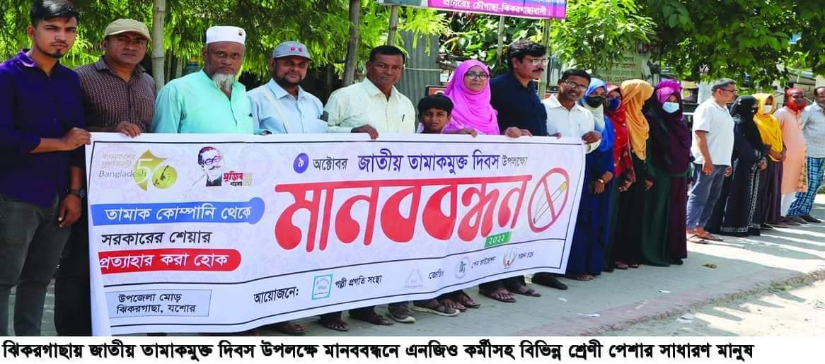 তামাক কোম্পানি থেকে সরকারের শেয়ার প্রত্যাহার করতে হবে এই স্লোগানকে সামনে রেখে যশোরের ঝিকরগাছা উপজেলায় জাতীয় তামাকমুক্ত দিবস উপলক্ষে মানববন্ধন অনুষ্ঠিত হয়েছে। রবিবার সকালে উপজেলা মোড়ের মানববন্ধনে অংশগ্রহণ করেন পল্লী প্রগতি সংস্থা (পিপিএস), ঝিকরগাছা ডেভেলপমেন্ট অর্গানাইজেশন (জেডিও), পেন ফাউন্ডেশন, স্বজন চক্র ও সমাধান সমাজ উন্নয়ন সংস্থা। এসময় উপস্থিত ছিলেন পিপিএস এর নির্বাহী পরিচালক আবুল কালাম আযাদ, জেডিও এর নির্বাহী পরিচালক মোঃ মনিরুজ্জামান মনির, পেন ফাউন্ডেশনের নির্বাহী পরিচালক মেঘনা ইমদাদ, স্বজন চক্রের নির্বাহী পরিচালক সুভাষ চন্দ্র ভক্ত বাবুল, সমাধান সমাজ উন্নয়ন সংস্থার নির্বাহী পরিচালক মোঃ আমিরুল কবীর, ঝিকরগাছা দারুল উলুম কামিল মাদ্রাসার সহকারী শিক্ষক মোঃ মোকলেছুর রহমান, কবি ও ছড়াকার টিপু সুলতান, কবি এম.এম নজরুল ইসলাম, শিক্ষক নুর ইসলাম, পেন ফাউন্ডেশনের হিসাবরক্ষক রত্না ইসলাম, স্বেচ্ছাসেবক শান্তাহার মিথি, আয়ুব হোসেনসহ প্রায় শতাধিক বিভিন্ন শ্রেণী পেশার সাধারণ মানুষ।