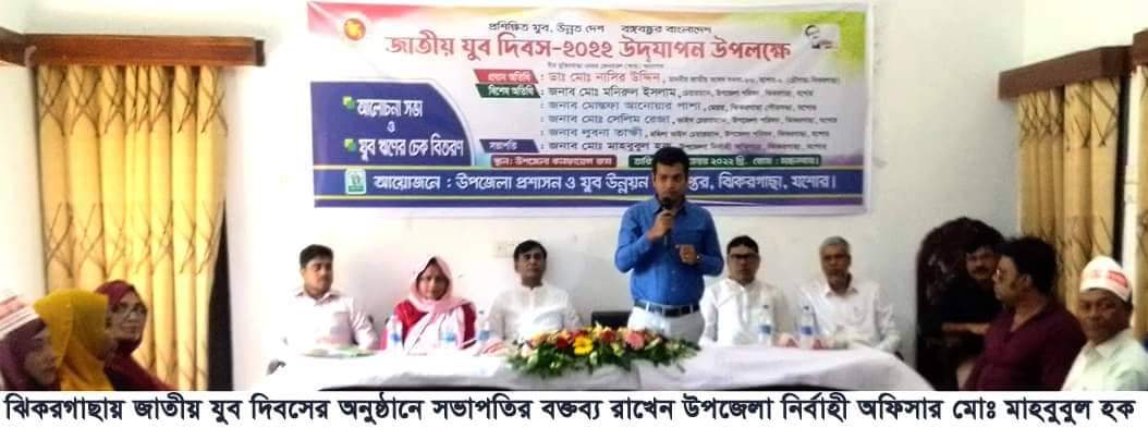 প্রশিক্ষিত যুব, উন্নত দেশ বঙ্গবন্ধুর বাংলাদেশ এই স্লোগানকে সামনে রেখে যশোরের ঝিকরগাছায় জাতীয় যুব দিবস পালিত হয়েছে। উপজেলা প্রশাসন ও উপজেলা যুব উন্নয়ন অধিদপ্তরের আয়োজনে মঙ্গলবার সকাল ১০টায় উপজেলা পরিষদ থেকে র্্যালী শেষে অফিসার্স ক্লাবের হলরুমে আলোচনা সভা ও ২৬জন যুব সংগঠকদের মাঝে ১৩ লক্ষ ৩০হাজার টাকার যুব ঋণের চেক বিতরণ অনুষ্ঠিত হয়। অনুষ্ঠানে উপজেলা নির্বাহী অফিসার মোঃ মাহবুবুল হক'র সভাপতিত্বে ও উপজেলা যুব উন্নয়ন অফিসার মোঃ আরব আলীর স্বাগত বক্তব্যের মাধ্যমে অনুষ্ঠানে বিশেষ অতিথি ছিলেন, উপজেলা চেয়ারম্যান মোঃ মনিরুল ইসলাম, উপজেলা ভাইস চেয়ারম্যান মোঃ সেলিম রেজা, মহিলা ভাইস চেয়ারম্যান লুবনা তাক্ষী, উপজেলা সমাজসেবা অফিসার মেজবাহ উদ্দিন। এসময় উপস্থিত ছিলেন, পেন ফাউন্ডেশনের নির্বাহী পরিচালক মেঘনা ইমদাদ, সজন চক্রের নির্বাহী পরিচালক সুভাষ ভক্ত, যুব সংগঠনের আত্মকর্মী নাসরিন আক্তার, সোহেল হাওলাদার প্রমুখ। অনুষ্ঠানটি সঞ্চালনা করেন, জেডিও সংগঠনের নির্বাহী পরিচালক মনিরুজ্জামান মনির।