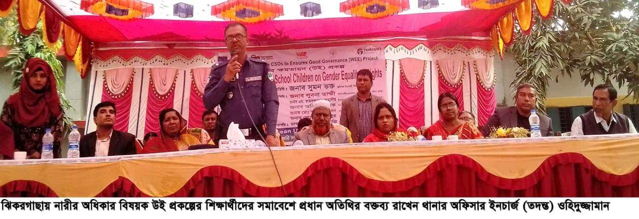যশোরের ঝিকরগাছা উপজেলায় নারীর অধিকারের উপর শিক্ষার্থীদের জন সমাবেশ অনুষ্ঠিত হয়েছে। ইউরোপিয়ান ইউনিয়ন, ট্রেইডক্রাফট এক্সচেঞ্জের অর্থায়নে এবং উলাসী সৃজনী সংঘ ও বিকাশ বাংলাদেশের বাস্তবায়নে সদর ইউনিয়নের কাশিপুর মাধ্যমিক বিদ্যালয় প্রাঙ্গণে বুধবার (২৫ জানুয়ারী) দুপুর ১২টার সময় মহিলা সিএসওএস স্কুলে জেন্ডার সমতা ও নারী অধিকার বিষয়ক সচেতনতা বৃদ্ধির লক্ষ্যে শিক্ষার্থীদের নিয়ে জন সমাবেশে প্রধান অতিথি ছিলেন থানার অফিসার ইনচার্জ (তদন্ত) ওহিদুজ্জামান ।