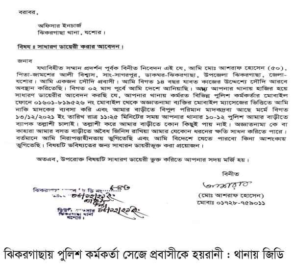 সাধরণ ডায়রীতে উল্লেখ করেছেন, মোঃ আশরাফ হোসেন বিগত ১৪বছর যাবৎ সৌদি প্রবাসী। তিনি গত ২মাস পূর্বে দেশে এসেছে। থানার কর্মরত বিভিন্ন পুলিশ কর্মকর্তার মোবাইল নং ০১৬০১-৮১৯৫২৬ থেকে অজ্ঞাতনামা ব্যক্তির মোবাইলে ম্যাসেজের ভিত্তিতে মাদক ব্যবসায়ী ও তার বাড়িতে বিপুল পরিমাণ মাদকদ্রব্য আছে মর্মে বিগত ১৩ ডিসেম্বর রাত ১১ টা ২৫ মিনিটের সময় থানার ১০-১২জন পুলিশ সদস্য ব্যাপক তল্লাশী চালায়। তল্লাশী করে প্রবাসীর বাড়ি হতে কোন কিছ্ইু পাওয়া যায়নি। অজ্ঞাতনামা কে বা কাহারা প্রবাসীর বসত বাড়িতে অবৈধ জিনিস রেখে প্রবাসীকে যে কোন ধরণের ক্ষতি সাধন করিতে পারে। বর্তমানে সে নিরাপত্তাহীনতায় এবং পুনরায় বিদেশ যেতে পারবে কিনা আশংকায় ভূগছে। ঝিকরগাছা থানার জিডি নং ৮৪৩। তাং ১৮/১২/২০২১ইং।