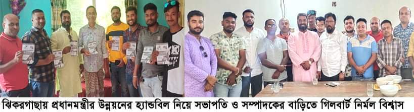 যশোরের ঝিকরগাছায় আওয়ামীলীগ সরকারের অধিনে মাননীয় প্রধানমন্ত্রী জননেত্রী শেখ হাসিনার উন্নয়নের বার্তা জনগণের মধ্যে পৌছানোর জন্য উন্নয়ন চিত্রের হ্যান্ডবিল জনসাধারণের কাছে পৌছানোর সাথে সাথে আওয়ামীলীগের সভাপতি জাহাঙ্গীর আলম মুকুল ও সাধারণ সম্পাদক মুসা মাহমুদের বাড়িতে গণসংযোগ করছেন, যশোর-২ (চৌগাছা-ঝিকরগাছা) আসনের মনোনয়ন প্রত্যাশী গঙ্গানন্দপুর ডিগ্রী কলেজের সম্মানিত সভাপতি, বাংলাদেশ হিন্দু-বৌদ্ধ-খ্রিষ্টান ঐক্য পরিষদের, ঝিকরগাছা উপজেলার আহবায়ক গিলবার্ট নির্মল বিশ্বাস। তিনি গতকাল সকাল থেকে সন্ধ্যা পর্যন্ত ঝিকরগাছা উপজেলার বিভিন্ন ইউনিয়নের ঘুরের গণসংযোগের মাধ্যমে এই কার্যক্রম পরিচালনা করেন। এসময় তার সফর সঙ্গী ছিলেন,