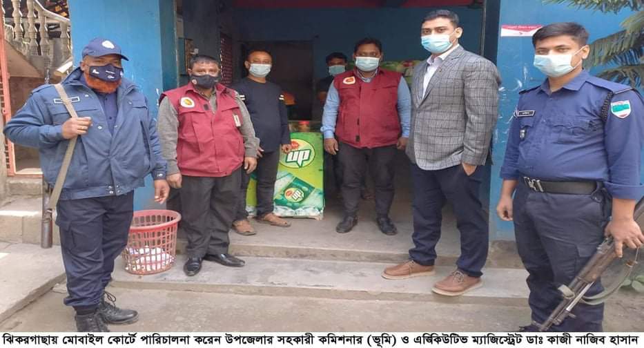 যশোরের ঝিকরগাছায় কোভিড-১৯ ও ওমিক্রন প্রতিরোধে মাস্ক পরিধান এবং স্বাস্থ্যবিধি না মানার কারণে মোবাইল কোর্টের মাধ্যমে জরিমানা আদায় করা হয়েছে। বৃহস্পতিবার দুপুর ১২টার সময় পৌর সদরের বাজার এলাকায় মোবাইল কোর্ট পরিচালনা করেন ঝিকরগাছা উপজেলার সহকারী কমিশনার (ভূমি) ও এক্সিকিউটিভ ম্যাজিস্ট্রেট ডাঃ কাজী নাজিব হাসান। তিনি মোবাইল কোর্টের মাধ্যমে মাস্ক পরিধান না করা এবং স্বাস্থ্যবিধি না মানার কারণে দণ্ডবিধি ১৮৬০ এর ২৬৯ ধারায় ৩টি মামলা দায়ের করেন এবং নয়শত টাকা জরিমানা আদায় করেন।