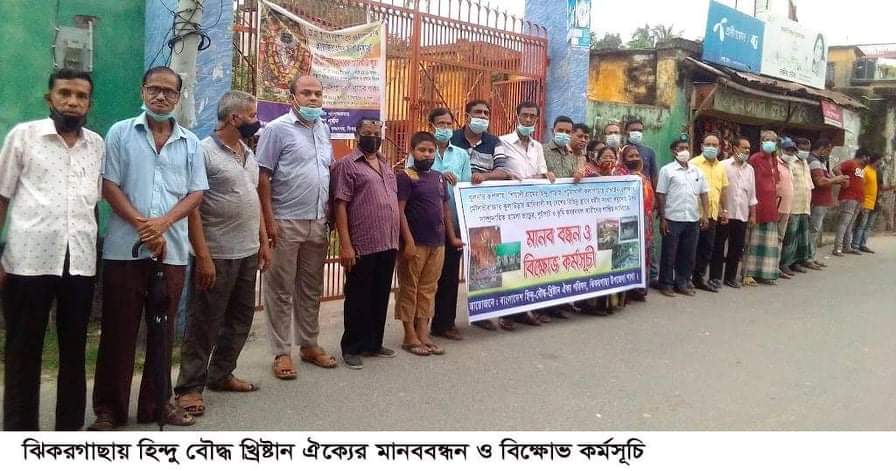 খুলনার রূপসায়, শিয়ালী গ্রামের হিন্দুপাড়ায়, পটুয়াখালী কলাপাড়ায় রাখাইন এলাকায় মৌলভীবাজার কুলাউড়ার আদিবাসী সহ দেশের বিভিন্ন স্থানে ধর্মীয় সংখ্যা লঘুদের উপর সাম্প্রদায়িক হামলা ভাংচুর, লুটপাট ও ভূমি জবরদখল কারীদের শাস্তির দাবিতে বাংলাদেশ হিন্দু-বৌদ্ধ-খ্রিস্টান ঐক্য পরিষদের ঝিকরগাছা উপজেলা শাখার আয়োজনে মানববন্ধন ও বিক্ষোভ কর্মসূচি অনুষ্ঠিত হয়েছে। বুধবার বিকাল সাড়ে ৫টায় ঝিকরগাছা কৃষ্ণনগরের কেন্দ্রীয় বারোয়ারী পূজা মন্দিরের সামনের এই আয়োজনে উপস্থিত ছিলেন, বাংলাদেশ হিন্দু-বৌদ্ধ-খ্রিস্টান ঐক্য পরিষদের ঝিকরগাছা উপজেলা শাখার আহবায়ক শ্যামল কুমার মোদক, যুগ্ম আহবায়ক নিরোদ বিশ্বাস, সুকদেব সরকার, সদস্য নিমাই চন্দ্র ঘোষ, অলোক দত্ত, মিনাল কান্তি দত্ত, শিশির ঘোষ, শিশির শাহ, দিপক দত্ত প্রমুখ।