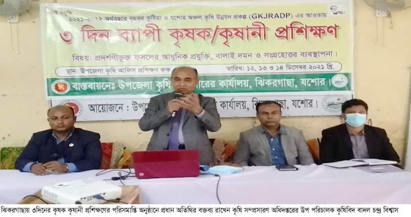 কৃষিই সমৃদ্ধি এই স্লোগানকে সামনে রেখে যশোরের ঝিকরগাছা উপজেলা কৃষি অফিসারের কার্যালয়ের আয়োজনে ২০২১-২২ অর্থবছরে বৃহত্তর কুষ্টিয়া ও যশোর অঞ্চল কৃষি উন্নয়ন প্রকল্পের আওতায় ৩০জন কৃষক কৃষানীর মধ্যে ৩দিনের প্রশিক্ষণের পরিসমাপ্তি হয়েছে। প্রদর্শনীভুক্ত ফসলের আধুনিক প্রযুক্তি, বালাই দমন ও সংগ্রহোত্তর ব্যবস্থাপনা বিষয়ের উপর উপজেলা কৃষি অফিসের প্রশিক্ষণ কক্ষে মঙ্গলবার দুপুরে ১২টার আয়োজনে প্রধান অতিথি ছিলেনকৃষি সম্প্রসারণ অধিদপ্তরের উপ পরিচালক কৃষিবিদ বাদল চন্দ্র বিশ্বাস। উপজেলা কৃষি অফিসার কৃষিবিদ মোঃ মাসুদ হোসেন পলাশ’র সভাপতিত্বে বিশেষ অতিথিকৃষি সম্প্রসারণ অধিদপ্তর’র এডিডি(পিপি) কৃষিবিদ সৌমিত্র সরকার, কৃষি সম্প্রসারণ অফিসার কৃষিবিদ মোঃ আব্দুল্ল্যাহ আল মামুন, সাংবাদিক আফজাল হোসেন চাঁদ, উপ সহকারী উদ্ভিদ সংরক্ষণ অফিসার মোঃ মফিজুর রহমান, সহকারী কৃষি অফিসার নয়নানন্দন পাল, মহাদেব কুমার দাশ প্রমুখ।