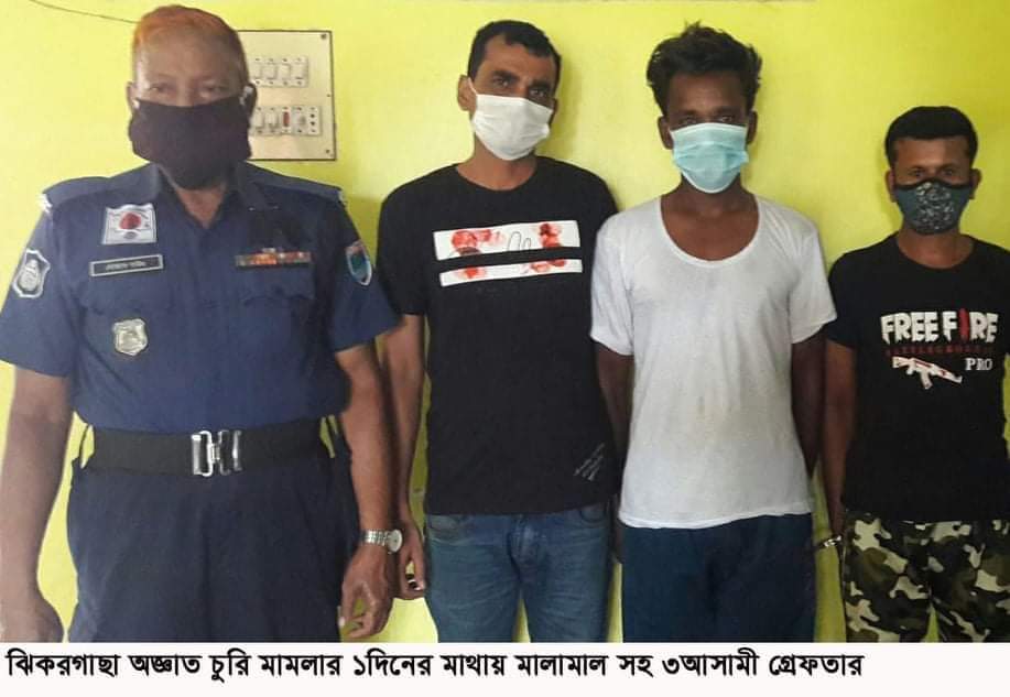 মামলার সূত্রে জানা যায়, ঝিকরগাছা উপজেলার গদখালী সদিরআলী গ্রামের মৃত কোমর আলী মোড়লের ছেলে মোঃ মোশারেফ হোসেন @ মুসা (৩৬) বাদি হয়ে অজ্ঞাতনামা আসামী দিয়ে একটি চুরি মামলা করেন। যে মামলায় তিনি উল্লেখ করেন, তার শ্বশুর মারা যাওয়ার পরে তিনিসহ তার পরিবারের সদস্যরা বাদির শ্বশুর বাড়িতে অবস্থান করার সুযোগে অজ্ঞাতনামা চোর বা চোরেরা বাদির বসতবাড়ি ফাঁকা পেয়ে বাড়ির গেটের গ্রীলের তালা ভেঙ্গে ফ্লাটে প্রবেশ করে তাহার শয়ন কক্ষের দরজার তালা ভেঙ্গে কক্ষের মধ্যে থাকা আলমারীর ভিতর হতে স্বর্ণ ও রুপা এবং নগদ টাকা চুরি করে নিয়ে যায়। এই ঘটনাকে কেন্দ্র করে মামলার তদন্তকারী অফিসার এসআই (নিঃ) সিরাজুল ইসলাম সিরাজ বুধবার (০৪ আগষ্ট) ঘটনাস্থলে গিয়ে মামলার সাথে জড়িত সন্ধেহে গদখালী সদির আলী গ্রামের মৃত আব্দুল লতিফের ছেলে মোঃ সাইফুল ইসলাম (৪০) কে গ্রেফতার করেন। পরবর্তীতে তাকে জিজ্ঞাসাবাদের পরে সে উক্ত বাড়িতে চুরি করার কথা স্বিকার করে এবং তার স্বিকারোক্তিতে চুরির মালামাল সহ চুরির সাথে সংযুক্ত শার্শা উপজেলার নাভারণ রেল বাজারের মৃত মাসুম সর্দারের চেলে সাইদুল আলম (৪৮) এবং ঝিকরগাছা পৌর সদরের পুরন্দরপুর গ্রামের মো আনছার আলীর ছেলে ও মুসলিম জুয়েলার্সের মালিক আহম্মেদ রাজু (৩৫) কে মালামাল সহ গ্রেফতার করেছেন। থানায় মামলা নং ০৪, তারিখ-০৩/০৮/২০২১।