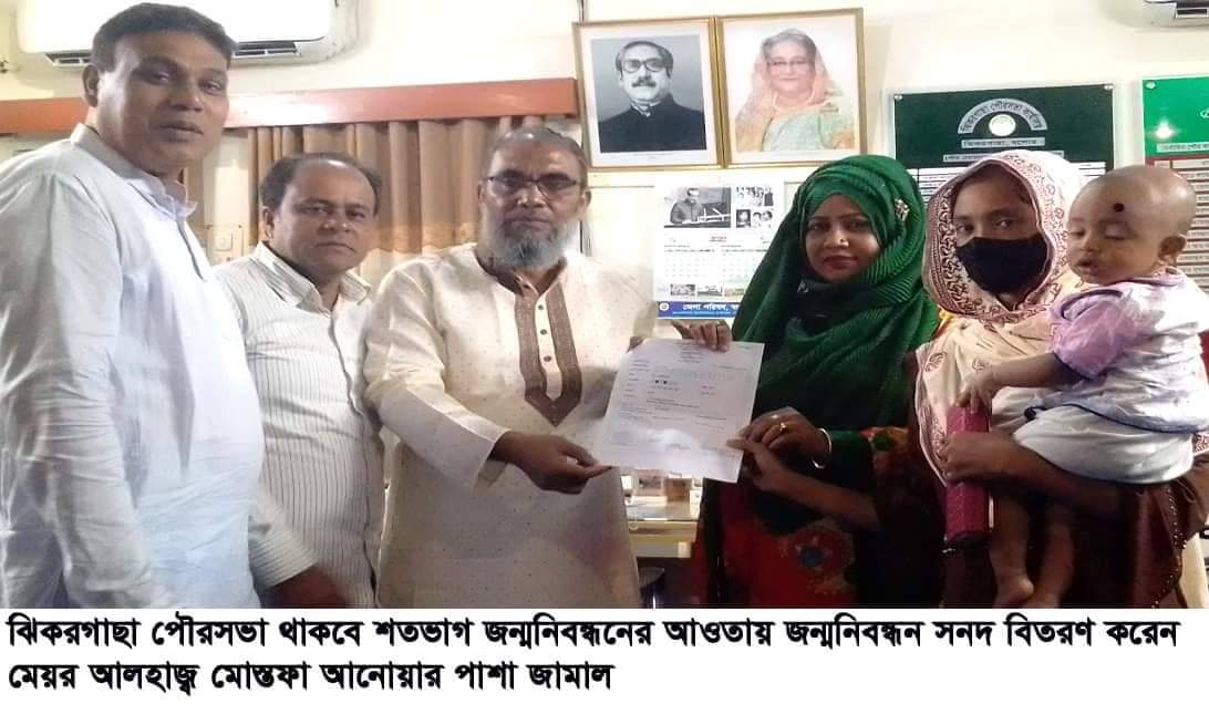 ঝিকরগাছা পৌরসভায় থাকবে নবজাতক শিশুদের আনা হবে শতভাগ জন্মনিবন্ধনের আওতায়। কোন উপজেলা বা পৌরসভা কি করলো এটা আমার দেখার বিষয় না। আমি চাই আমার পৌরসভা দেশের মধ্যে প্রথম অবস্থানে থাকবে পৌরসভার মেয়র আলহাজ্ব মোস্তফা আনোয়ার পাশা জামাল। সোমবার বেলা ১২টার সময় তার নিজ কার্যালয়ে পৌর কাউন্সিলরদের সাথে এক আলোচনায় এই কথা বলেন। উক্ত সময় পৌরসদরের মোবারকপুর গ্রামের নুরুল হকের ছেলে সাজিদ হকের জন্মনিবন্ধন বিতরণ করেন। এসময় উপস্থিত ছিলেন, প্যানেল মেয়র আমিরুল ইসলাম রাজা, সংরক্ষিত কাউন্সিলর জেসমিন সুলতানা, শ্যামলী খাতুন, নাজমুন নাহার, কাউন্সিলর আরিফুর রহমান, আলীম গাজী, একরামুল হক খোকন, তারিকুজ্জামান সহ অন্যান্য কাউন্সিলর ও পৌর কার্যালয়ের কর্মকর্তা-কর্মচারীবৃন্দ।