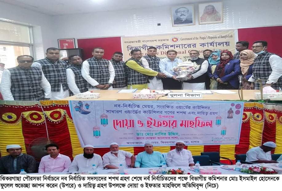অপরদিকে শপথ গ্রহণ শেষে ঝিকরগাছা পৌরসভা নির্বাচনে নব নির্বাচিত মেয়র, সংরক্ষিত মহিলা কাউন্সিলর ও সাধারণ আসনের সদস্যদের দায়িত্ব গ্রহণ উপলক্ষে পৌর মেয়রের আয়োজনে বিকালে উপজেলা পরিষদের মধ্যে পৌরসভা চত্ত্বরে দোয়া ও ইফতার মাহফিল অনুষ্ঠিত হয়। দোয়া ও ইফতার মাহফিলে প্রধান অতিথি ছিলেন, যশোর-২ (চৌগাছা-ঝিকরগাছা) আসনের জাতীয় সংসদ সদস্য বীর মুক্তিযোদ্ধা মেজর জেনারেল (অবঃ) অধ্যাপক ডাঃ মোঃ নাসির উদ্দিন। অনুষ্ঠানের পৌরসভার মেয়র আলহাজ্ব মোস্তফা আনোয়ার পাশা জামালের সভাপতিত্বে উপস্থিত ছিলেন সাবেক বিদ্যুৎ জ্বালানী ও খনিজ সম্পদ প্রতিমন্ত্রী অধ্যাপক রফিকুল ইসলাম, উপজেলা পরিষদের চেয়ারম্যান মোঃ মনিরুল ইসলাম, উপজেলা নির্বাহী অফিসার মোঃ মাহবুবুল হক, সহকারী কমিশনার (ভূমি) ডাঃ কাজী নাজিব হাসান, থানার অফিসার ইনচার্জ সুমন ভক্ত, যশোর পল্লী বিদ্যুৎ সমিতি-১ এর ঝিকরগাছা জোনাল অফিসের ডিজিএম টিএম মেসবাহ উদ্দিন, ভাইস চেয়ারম্যান সেলিম রেজা, মহিলা ভাইস চেয়ারম্যান লুবনা তাক্ষী প্রমুখ।