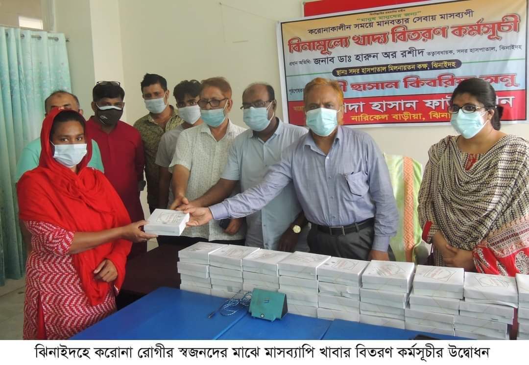 ঝিনাইদহ সদর হাসপাতালের করোনা ইউনিটে রোগী ও রোগীর স্বজনদের মাঝে দুই মাসব্যাপি বিনামূল্যে খাবার বিতরণ কার্যক্রম শুরু হয়েছে। বুধবার সকালে ঝিনাইদহ সদর হাসপাতাল মিলনায়েতনে রাশিদা হাসান ফাউন্ডেশন’র পক্ষ থেকে এ খাবার বিতরণ কার্যক্রমের আনুষ্ঠানিক উদ্বোধন করা হয়। কর্মসূচীর উদ্বোধন করেন সদর হাসপাতালের তত্ববধায়ক ডাঃ হারুন অর রশিদ। বেসরকারি স্বেচ্ছাসেবী সংগঠন রাশিদা হাসান ফাউন্ডেশনের উপদেষ্টা মুক্তিযোদ্ধা গোলাম মোস্তফা লোটনের সভাপতিত্বে অনুষ্ঠানে বিশেষ অতিথি ছিলেন সদর হাসপাতালের আরএমও ডাঃ মিথিলা ইসলাম, ফাউন্ডেশনের পরিচালক আলি হাসান কিবরিয়া, সহ-সভাপতি জাকারিয়া মিঠু, ঝিনাইদহ জেলা সোসাইটির সাবেক যুগ্ম সম্পাদক সাইফুর রহমান মিঠু ও সাংবাদিক এম সাইফুল মাবুদ।