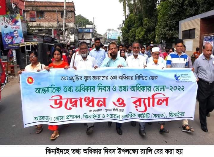 ‘তথ্য প্রযুক্তির যুগে জনগণের তথ্য অধিকার নিশ্চিত হোক’ এ শ্লোগানকে সামনে রেখে ঝিনাইদহে ২ দিন ব্যাপী তথ্য অধিকার মেলা শুরু হয়েছে। জেলা প্রশাসন ও সনাকের আয়োজনে বুধবার সকালে শহরের পুরাতন ডিসি কোর্ট চত্বরে জাতীয় পতাকা উত্তোলন ও বেলুন উড়িয়ে মেলার উদ্বোধন করেন অতিরিক্ত জেলা প্রশাসক সেলিম রেজা। উদ্বোধন শেষে একটি র্যালী বের করা হয়। র্যালীটি শহরের বিভিন্ন সড়ক ঘুরে একই স্থানে এসে শেষ হয়। পরে পুরাতন ডিসি কোর্ট মুক্তমঞ্চে আলোচনা সভা অনুষ্ঠিত হয়। সচেতন নাগরিক কমিটির (সনাক) সভাপতি সায়েদুল আলমের সভাপতিত্বে বক্তব্য রাখেন, অতিরিক্ত জেলা প্রশাসক (সার্বিক) সেলিম রেজা, সদর উপজেলা নির্বাহী কর্মকর্তা এস এম শাহীন, জেলা তথ্য কর্মকর্তা আবু বকর সিদ্দিক, সমাজসেবা অধিদপ্তরের উপ-পরিচালক আব্দুল লতিফ সেখ, জেলা প্রাথমিক শিক্ষা কর্মকর্তা জাহাঙ্গীর আলম, সনাকের সহ-সভাপতি সাংবাদিক এম সাইফুল মাবুদ ও সাবেক উপাধ্যক্ষ এন এম শাহজালাল। আলোচনা সভায় বক্তারা, তথ্যের অবাধ প্রবাহের নিশ্চিত করতে তথ্য অধিকার আইন পুরোপুরি বাস্তবায়ন করার আহবান জানান। আলোচনা সভা শেষে বিভিন্ন স্টল পরিদর্শন করা হয়। দুই দিন ব্যাপী এ তথ্য মেলায় সরকারি ও বেসরকারি ২৯ টি দপ্তরের স্টল রয়েছে।