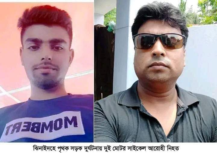 ঝিনাইদহে পৃথক সড়ক দুঘর্টনায় দুই মটরসাইকেল আরোহী নিহত হয়েছে। নিহতরা হলেন, জেলার শৈলকুপা উপজেলার ব্রহ্মপুর গ্রামের মুজিবর হোসেনের ছেলে কলেজ ছাত্র রাফি হোসেন (২৫) ও সদর উপজেলার ধোপাবিলা গ্রামের শ্রীবাস সরকারের ছেলে শংকর কুমার সরকার (৩০)। শনিবার সকালে ও শুক্রবার রাতে পৃথক এ দুর্ঘটনায় তারা নিহত হন। শৈলকুপা থানার ওসি আমিনুল ইসলাম জানান, শুক্রবার রাতে কলেজ ছাত্র রাফি বাড়ি থেকে বের হয়ে মোটরসাইকেল নিয়ে পাশ্ববর্তী নাদপাড়া গ্রামের উদ্দেশে রওয়ানা হন। পথে উপজেলার সারুটিয়া ইউনিয়নের ব্রহ্মপুর গ্রামে পৌঁছালে একটি পাটকাঠি বোঝাই ইঞ্জিনচালিত করিমন গাড়ির সঙ্গে মোটরসাইকেলের মুখোমুখি সংঘর্ষ হয়। এতে গুরুতর আহত হন রাফি। তাকে উদ্ধার করে কুষ্টিয়া জেনারেল হাসপাতালে নিয়ে গেলে রাত ১০টার দিকে চিকিৎসাধীন অবস্থায় তিনি মারা যান। এদিকে ঝিনাইদহ সদর উপজেলার শৈলমারী এলাকায় শনিবার সকালে মোটরসাইকেল ও নসিমনের সংঘর্ষে শংকর কুমার সরকার (৩০) নামের এক ফার্নিচার মিস্ত্রি আহত হন। তাকে উদ্ধার করে ঝিনাইদহ সদর হাসপাতালে নিয়ে গেলে কর্তব্যরত চিকিৎসক ডাঃ ফালগুনি তাকে মৃত ঘোষণা করেন। ঝিনাইদহ সদর থানার ওসি শেখ মোহাম্মদ সোহেল রানা বলেন, দুর্ঘটনার পর নসিমনটি আটক করা হলেও চালক পলাতক রয়েছে।