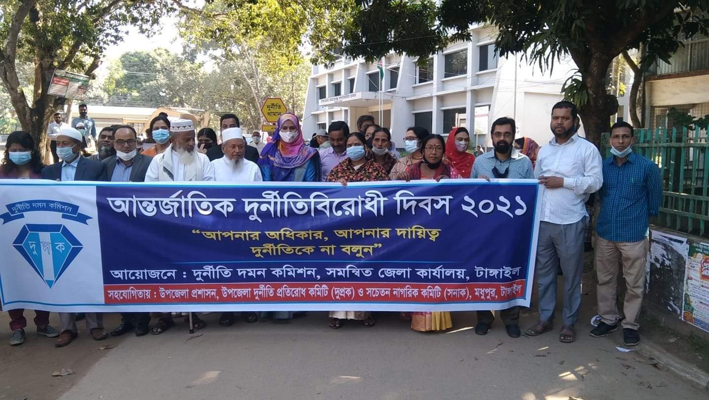দুর্নীতি দমন কমিশন টাঙ্গাইল জেলা সমন্বিত কার্যালয়ের উদ্যোগে মধুপুরে আন্তর্জাতিক দুর্নীতি বিরোধী দিবস পালিত হয়েছে। বৃহস্পতিবার উপজেলা প্রশাসন, উপজেলা দুর্নীতি প্রতিরোধ কমিটি (দুপ্রক) ও সচেতন নাগরিক কমিটি (সনাক) এর যৌথ উদ্যোগে এই কর্মসূচি বাস্তবায়ন করা হয়।