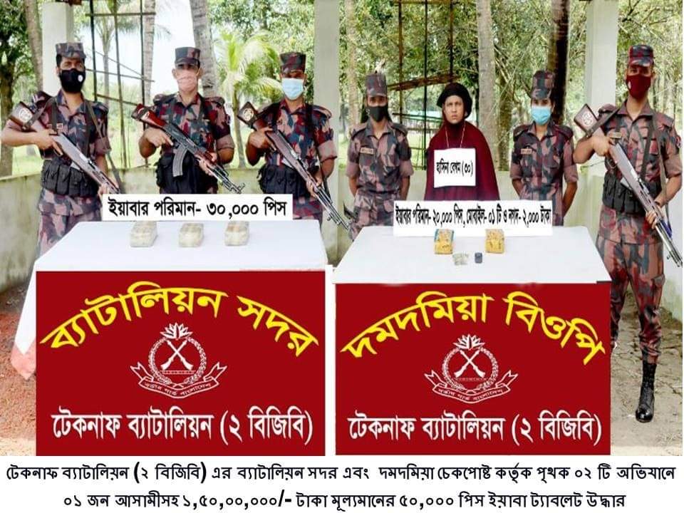 টেকনাফ ২ বিজিবি ব্যাটালিয়ানের অধিনায়ক লেঃ কর্ণেল ফয়সল হাসান খান স্বাক্ষরিত এক সংবাদ বিজ্ঞপ্তিতে (১০ আগষ্ট) বিকালে দেয়া তথ্যে জানাযায়, গত (৯ আগষ্ট) সন্ধায় টেকনাফ গামী একটি সিএনজি নারী যাত্রী সহ দমদমিয়া বিজিবি’র চেকপোস্টে পৌঁছলে ঐ নারী কে তল্লাশি চালিয়ে বোরকার ভিতরে থাকা ২০ পিস ইয়াবা সহ তাকে আটক করা হয়।