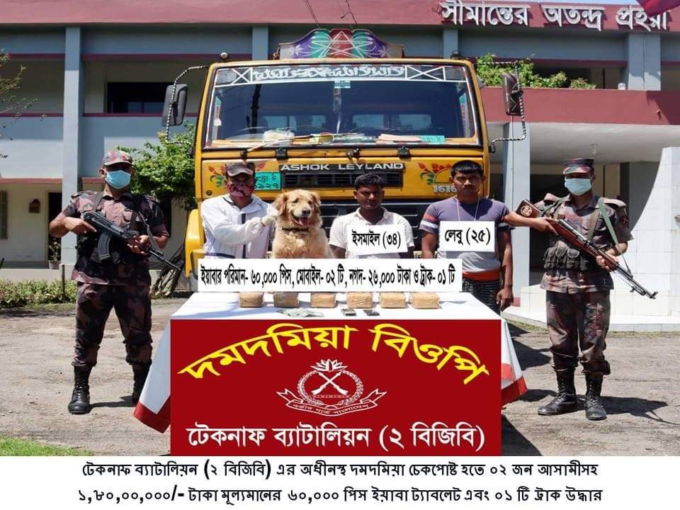 ২ বিজিবি অধিনায়ক জানান, দমদমিয়া চেকপোষ্টে বিজিবি সদস্যরা নিয়মিত টহলদলের সাথে তল্লাশী কার্যক্রম পরিচালনা করছিল। আনুমানিক ৯ টার দিকে টেকনাফ হতে কক্সবাজারগামী একটি ট্রাক দমদমিয়া চেকপোস্টে আসলে তা তল্লাশীর জন্য থামানো হয়। ডগ ব্রাভো ও হ্যান্ডেলারগণ যথারীতি তল্লাশী কার্যক্রম শুরু করলে ডগ ব্রাভো উক্ত ট্রাকের এয়ার ক্লিনার ফিল্টারে ক্রমাগত ঘ্রান নিতে থাকে এবং সন্দেহমূলক আচরণ প্রকাশ করে। পরবর্তীতে ডগ হ্যান্ডেলার কর্তৃক ট্রাকের এয়ার ক্লিনার ফিল্টার খুলে বিস্তারিতভাবে নীরিক্ষার সময় ট্রাকের এয়ার ক্লিনার ফিল্টারের ভিতরে অভিনব পদ্ধতিতে ফিটিং অবস্থায় কালো টেপ দিয়ে মোড়ানো কয়েকটি প্যাকেট উদ্ধার করে। উদ্ধারকৃত প্যাকেটগুলো খুলে প্যাকেটের ভিতর হতে ৬০ হাজার ইয়াবা জব্দ করতে সক্ষম হয়। উদ্ধারকৃত ইয়াবার আনুমানিক মুল্য ১ কোটি ৮০ লাখ টাকা।