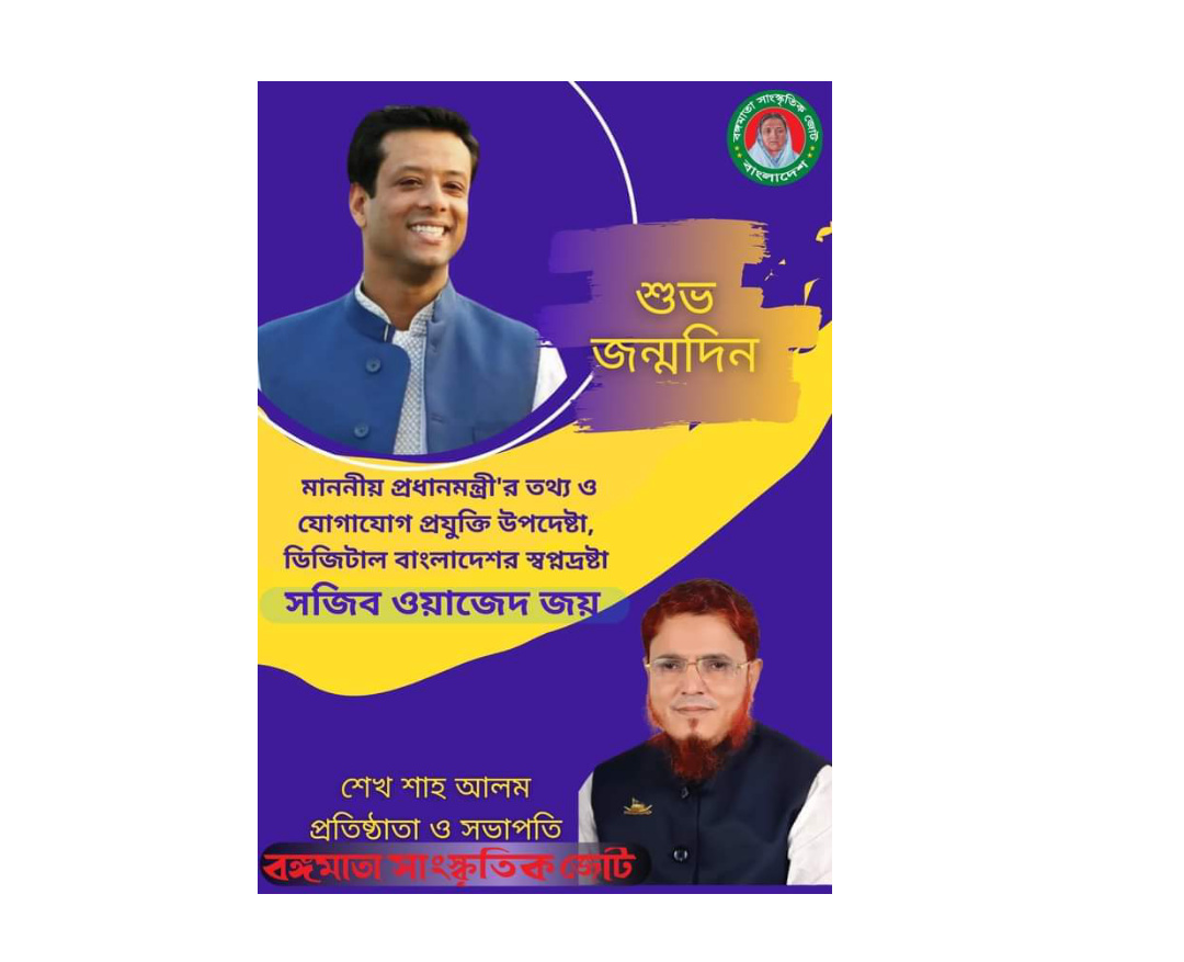 ডিজিটাল বাংলাদেশের স্বপ্নদ্রষ্টা সজীব ওয়াজেদ জয়'ৱ শুভ জন্মদিনের শুভেচ্ছা জানিয়েছেন -শেখ শাহ আলম প্রতিষ্ঠাতা ও সভাপতি বঙ্গমাতা সংস্কিতিক জোট ।