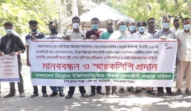 সিরাজগঞ্জ সদর উপজেলা প্রতিনিধিঃবিশ্বের সাথে তাল মিলিয়ে চলার আন্তর্জাতিক মানের ৪ বছর মেয়াদি ডিপ্লোমা ইঞ্জিনিয়ারিং শিক্ষাকোর্সকে ৩ বছরে রূপান্তরে অযৌক্তিক ও আত্মঘাতি উদ্যোগ বন্ধ , বিএনবিসি - ২০২০ এর জনস্বার্থবিরোধী সংজ্ঞা ও ধারা উপধারা সংশোধন,ডিপ্লোমা ইঞ্জিনিয়ারিং শিক্ষার অশিম সংকট সমাধান ও ছাত্র শিক্ষক পেশাজীবীদের পেশাগত সীমাহীন সমস্যার সমাধানে মাননীয় প্রধানমন্ত্রী জননেত্রী শেখ হাসিনার প্রতিশ্রুত ও নির্দেশিত ৪ দফা বাস্তবায়নের দাবিতে মানববন্ধন ও স্মারকলিপি
