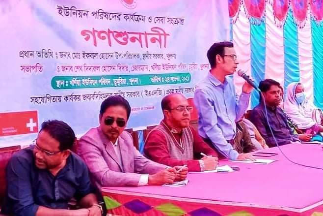 খুলনার ডুমুরিয়া উপজেলার খর্ণিয়া ইউনিয়নে কার্যকর ও জবাবদিহিমূলক স্থানীয় সরকার ( ইএএলজি) প্রকল্পের আওতায় ইউনিয়ন পর্যায়ে গণশুনানি অনুষ্ঠিত হয়েছে।গতকাল বুধবার (২৪ নভেম্বর) বিকাল ৩ টায় খর্ণিয়া ইউনিয়ন পরিষদের আয়োজনে ইউনিয়ন পরিষদ কার্যালয়ে ইএএলজি প্রকল্পের আওতায় ইউনিয়ন পর্যায়ে গণশুনানি অনুষ্ঠানে প্রধান অতিথি হিসেবে বক্তব্য রাখেন,খুলনা জেলা স্থানীয় সরকারের উপ-পরিচালক মোঃ ইকবাল হোসেন। খর্ণিয়া ইউনিয়ন পরিষদের চেয়ারম্যান শেখ দিদারুল হোসেন দিদার এর সভাপতিত্বে ও মোঃ কামরুজ্জামান এর সঞ্চালনায় সর্বস্তরের জনগণ জবাবদিহিমূলক প্রশ্ন করে সন্তোষজনক উত্তর পেয়ে জনগনের পক্ষ থেকে সদ্য নির্বাচিত চেয়ারম্যান শেখ দিদারুল হসেন দিদার এর গলায় ফুলের মালা দিয়ে বরণ করে নেন। এসময় চেয়ারমান উপস্থিত সকল সদস্য সদস্যাদের সাথে নিয়ে স্বচ্ছভাবে কাজ করার প্রতিশ্রুতি দেন। এসময় অনুষ্ঠানে আরো উপস্থিত ছিলেন, ইউনিয়ন পরিষদের সদ্য নির্বাচিত ইউপি সদস্য সদস্য বৃন্দ, ডুমুরিয়া থানা এস আই আব্দুল করিম,গ্রাম পুলিশের সদস্যগণ,সামাজিক ও রাজনৈতিক ব্যক্তিবর্গ, সাংবাদিক, প্রকল্পের সুবিধাভোগী ও এলাকার গন্যমান্য ব্যাক্তিবর্গ।