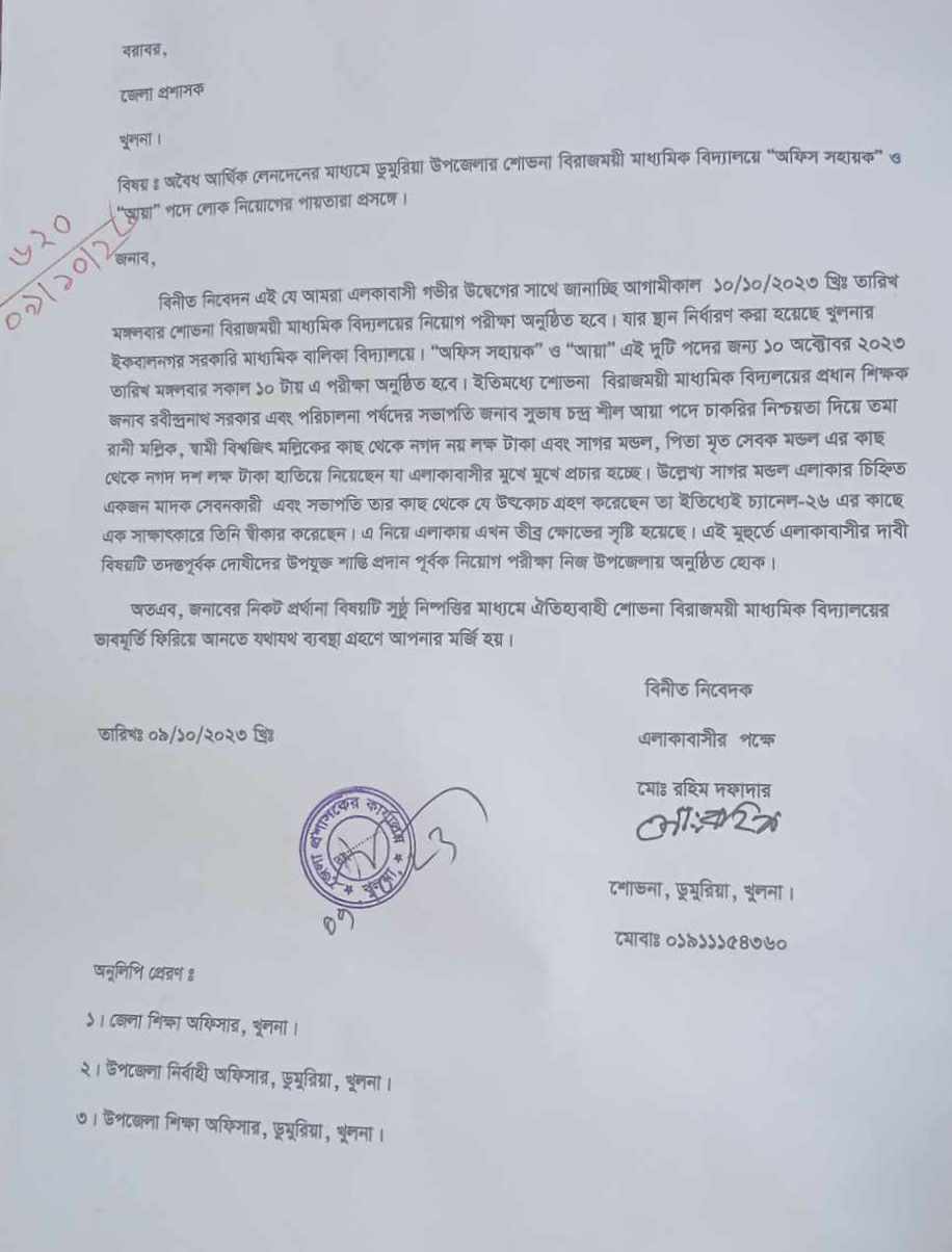 ডুমুরিয়ার শোভনা বিরাজময়ী মাধ্যমিক বিদ্যালয়ে আয়া এবং অফিস সহায়ক পদে নিয়োগে ১৯ লক্ষ টাকা নিয়োগ বাণিজ্যের অভিযোগ উঠেছে।এলাকাবাসির পক্ষে মোঃ রহিম বাদী হয়ে খুলনা জেলা প্রশাসক বরাবর এবং সংশ্লিষ্ট দপ্তরে লিখিত অভিযোগ দাযের করেছেন। অভিযোগে তিনি উল্লেখ করেন,আগামীকাল ১০ অক্টোবার শোভনা বিরাজময়ী মাধ্যমিক বিদ্যলয়ের “অফিস সহায়ক" ও "আয়া” এই দুটি পদের জন্য নিয়োগ পরীক্ষা অনুষ্ঠিত হওয়ার কথা রয়েছে। নিয়োগ সংক্রান্ত অনিয়ম তুলে এলাকাবাসী ক্ষোভ বিক্ষোভ করতে পারে এমন শঙ্কায় পরিক্ষা স্থান নির্ধারিত করা হয় খুলনা নগরীর ইকবালনগর সরকারি মাধ্যমিক বালিকা বিদ্যালয়ে। ইতোমধ্যে শোভনা বিরাজময়ী মাধ্যমিক বিদ্যলয়ের প্রধান শিক্ষক রবীন্দ্রনাথ সরকার এবং পরিচালনা পর্ষদের সভাপতি জনাব সুভাষ চন্দ্র শীল আয়া পদে চাকরির নিশ্চয়তা দিয়ে বিশ্বজিৎ মল্লিকের স্ত্রী তমা রানী মল্লিকের কাছ থেকে নগদ নয় লক্ষ টাকা এবং মৃত সেবক মন্ডল এর ছেলে সাগর মন্ডল এর কাছ থেকে নগদ দশ লক্ষ টাকা হাতিয়ে নিয়েছেন বলেও অভিযোগ রয়েছে।স্থানীয় এলাকাবাসী সুত্রে জানা গেছে নানা অনিয়মের অভিযোগে ইতোপূর্বে দুই দুই বার উক্ত পদের নিয়োগ পরিক্ষা বাতিল করেছিলেন সংশ্লিষ্ট কতৃপক্ষ। ফলে এবার নতুন কৌশল হাতে নিয়েছেন বিদ্যালয় ম্যানেজিং কমিটি। কমপক্ষে ৩ জন প্রার্থী না হলে পরিক্ষা বাতিল হয়,সে কারনে অফিস সহায়ক পদে সাগর মন্ডল ফাইনাল হলেও চয়ন বসাক এবং রাসেল শেখ নামের দুই জন প্রার্থী পরিক্ষায় অংশগ্রহন করে পরিক্ষাটি সম্পন্ন করবেন। এদিকে আয়া পদে তমা রানী মল্লিক ফাইনাল হলেও তার সাপোটিং হিসেবে লক্ষী বিশ্বাস ও শম্পা রানী নামের দুই জন প্রার্থী পরিক্ষায় অংশগ্রহন করবেন বলে একাধিক সুত্র জানিয়েছেন।অফিস সহায়ক পদে গৌতম, শুভজিৎ, সোহাগ ও অমারেশ অনিয়মের কারনে পরিক্ষায় অংশগ্রহন করবে না বলে জানা গেছে। একই সাথে আয়া পদে অর্পনা, রীতা, বন্ধনা ও অমৃতা অনিয়মের কারনে পরিক্ষায় অংশগ্রহন করবে না বলে জানা যায়। এব্যাপারে শোভনা বিরাজময়ী মাধ্যমিক বিদ্যলয়ের পরিচালনা পর্ষদের সভাপতি জনাব সুভাষ চন্দ্র শীল এক ভিডিও সাক্ষাৎকারে বলেন তার ভাগে মাত্র ২ লাখ টাকা পড়েছে। কিন্তু পরবর্তীতে তিনি তার ব্যবহৃত মোবাইল ফোনে কল দিলেও ফোনটি রিসিভ করেনি।প্রধান শিক্ষক রাবিন্দ্র নাথ সরকার বলেন টাকা লেনদেনের বিষয়ে তিনি কিছুই জানেন না।