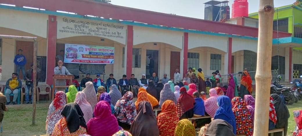 জি এম আবু মুসা'র সঞ্চালনায় উপজেলার সাহস ইউনিয়নের জি কে এস কে আদর্শ মাধ্যমিক বিদ্যালয় প্রাঙ্গনে ১৫০ জন দুস্থ ও অসহায় শীতার্ত পরিবারের মাঝে শীতবস্ত্র কম্বল বিতরণ অনুষ্ঠানে প্রধান অতিথি হিসেবে উপস্থিত ছিলেন, ডুমুরিয়া ফাউন্ডেশনের সহ-সভাপতি রবিউল ইসলাম বাবু ,বিশেষ অতিথি ছিলেন প্রফেসর মাসুদ আলম গোলদার,জাহাঙ্গীর আলম মুকুল, শেখ মোহাম্মদ জাকির হোসেন প্রমুখ।
