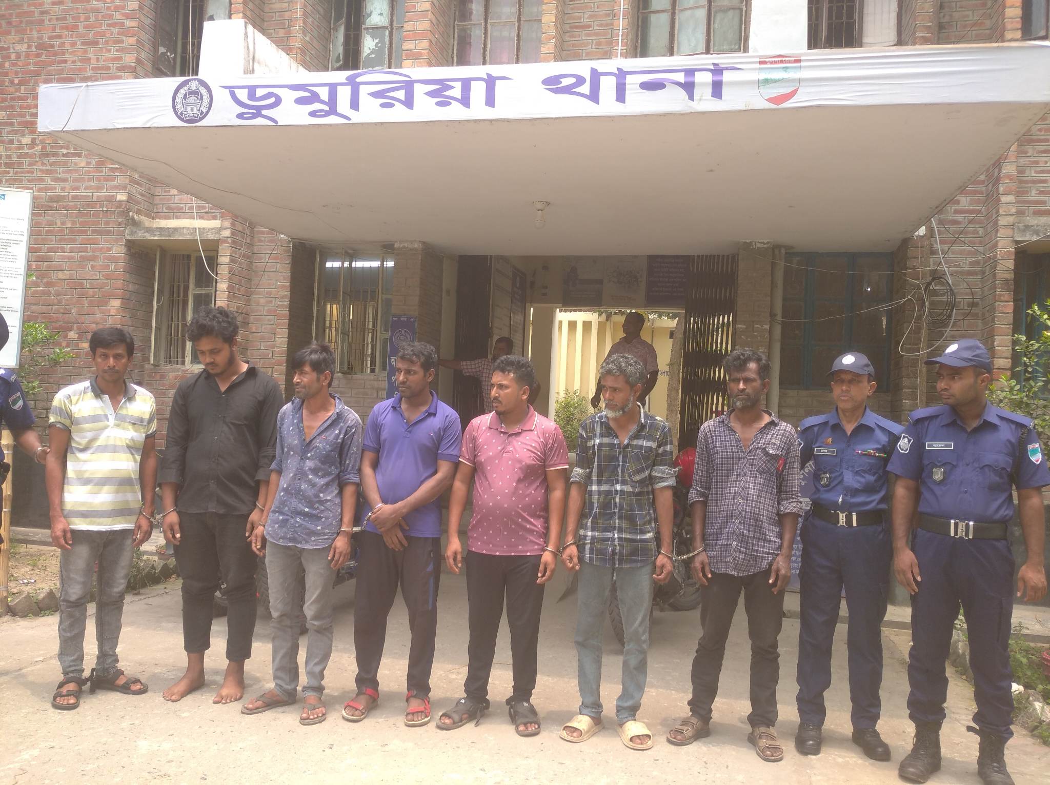 থানা পুলিশ ও মামলার এজাহার সূত্রে জানা যায় গতকাল ৮মে রাত ৩টায় দিকে ডুমুরিয়া থানা পুলিশ রাত্রি কালীন ডিউটি চলাকালে এসআই বিশ্বজিৎ পাল গোপন সংবাদের মাধ্যমে জানতে পারেন খুলনা ডুমুরিয়া উপজেলার উত্তর গোবিন্দ কাটি গ্রামের মিন্টু শেখের বাড়ির সামনে একটি পিকআপ সহ ১০-১২ জন ডাকাত সদস্য মিন্টু শেখের বাড়িতে ডাকাতের করার উদ্দেশ্যে অবস্থান করছে, তাৎক্ষণিকভাবে বিষয়টি থানার অফিসার ইনচার্জকে জানালে তাহার নির্দেশে রাত্রি কালীন ডিউটিতে নিয়োজিত অন্যান্য অফিসার ও ফোর্স সম্মিলিতভাবে অভিযান পরিচালনা করে ডাকাতির কাজে ব্যবহৃত একটি পিকআপ, দুটি ধারালো চাপাতি, তিনটি লোহার রড, স্যালাইন রেঞ্জ ও বিভিন্ন ধরনের ডাকাতির সরঞ্জাবি সহ তাদেরকে আটক করা হয়েছে।,বাকি ৪-৫ জন ডাকাত সদস্য অস্ত্রসহ পালিয়ে যায়, প্রাথমিক জিজ্ঞাসাবাদে জানা যায় আটকৃত ডাকাত সদস্যদের মধ্যে কয়েকজনের বিরুদ্ধে দেশের বিভিন্ন থানায় ডাকাতি, আগ্নেয়াস্ত্রসহ বিভিন্ন অপরাধে জড়িত থাকার ঘটনায় মামলা রয়েছে, আটকৃত ডাকাত সদস্য ১ মোঃ ইদ্রিস আলী (২১)২। মোঃ খোকন মিয়া ( ২৮) ৩। আলামিন খলিফা (৪০) ৪। মামুন মিয়া ওরফে লালচান ( ৪৫) ৫। ইউসুফ শেখ (২৬)৬। ইব্রাহিম হাওলাদার (৩৫) ৭। রফিকুল ইসলাম নয়ন (৩২)। এই ঘটনায় ডুমুরিয়া থানার এসআই বিশ্বজিৎ পাল বাদী হয়ে ডাকাতির প্রস্তুতি মামলা করেন এবং পলাতক অন্যান্য ডাকাত দলের সদস্যদের গ্রেপ্তারসহ তাদের দলে থাকা অবৈধ আগ্নেয় অস্ত্র উদ্ধারে ডুমুরিয়া থানা পুলিশের অভিযান অব্যাহত আছে।