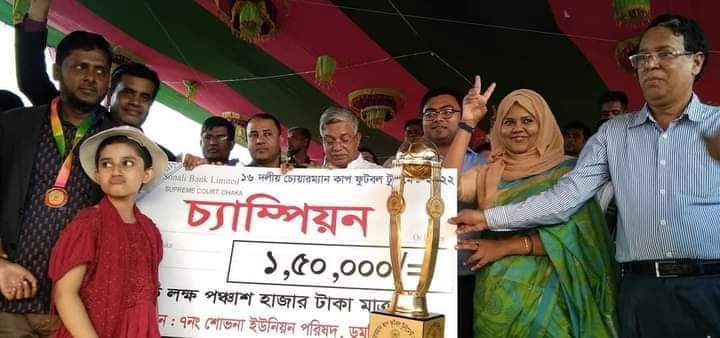 খুলনার ডুমুরিয়ার শোভনা ইউনিয়ন পরিষদের আয়োজনে ১৬ দলীয় চেয়ারম্যান কাপ ফুটবল টুর্নামেন্টের চুড়ান্ত পর্বের খেলা অনুষ্ঠিত হয়েছে। শনিবার বিকেলে শোভনা গাবতলা ঐক্যতান যুব সংঘ মাঠে আয়োজিত খেলায় অংশ গ্রহণ করেন ডুমুরিয়া সদর ইউনিয়ন ফুটবল দল বনাম ধামালিয়া ইউনিয়ন ফুটবল দল। খেলায় নির্ধারিত সময়ে উভয় দল গোল শূন্য অবস্থায় সমতা থাকে। পরবর্তীতে ট্রাইব্রেকারের মাধ্যমে ডুমুরিয়া সদর ইউনিয়ন ফুটবল দল ১১-১০ গোলে ধামালিয়া ইউনিয়নকে পরাজিত করে চ্যাম্পিয়ন হন। রানার্সআপ হন ধামালিয়া ইউনিয়ন একাদশ। ম্যান অফ দ্যা ম্যাচ হন ইরান, ম্যান অফ দ্যা টুর্ণামেন্ট মেহেদী এবং সেরা দর্শক নির্বাচিত হন জমির উদ্দিন সরকার। খেলা পরিচালনা করেন শেখ কামাল আহমেদ, সহকারী হিসাবে ছিলেন মোশারফ হোসেন ও পারভেজ।