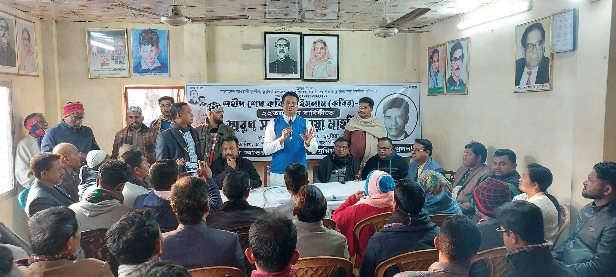 বাংলাদেশ আওয়ামী যুবলীগ,ডুমুরিয়া উপজেলা শাখার সাবেক সভাপতি ও ডুমুরিয়া সদর ইউনিয়ন পরিষদের চেয়ারম্যান শহীদ শেখ কবিরুল ইসলাম এর ২২তম মৃত্যুবার্ষিকী পালিত হয়েছে। আজ ৫শে জানুয়ারি বৃহস্পতিবার বিকাল ৩টায় ডুমুরিয়া উপজেলা আওয়ামী লীগের দলীয় কার্যালয়ে উপজেলা আওয়ামী যুবলীগের উদ্যোগে আয়োজিত স্মরণ সভা ও দোয়া মাহফিল অনুষ্ঠানে সভাপতিত্ব করেন উপজেলা যুবলীগের আহবায়ক প্রভাষক গোবিন্দ ঘোষ। সভায় অতিথি হিসেবে উপস্হিত ছিলেন ডুমুরিয়া উপজেলা আওয়ামী লীগের সহসভাপতি আবু সাঈদ সরদার, শেখ নাজিবুর রহমান, সাংগঠনিক সম্পাদক জিএম ফারুক হোসেন, দপ্তর সম্পাদক খান আবু বক্কার, প্রচার সম্পাদক মোল্লা জাহিদুল ইসলাম, কৃষি বিষয়ক সম্পাদক সরদার আবদুল গণি, বন ও পরিবেশ বিষয়ক সম্পাদক মোল্লা সোহেল রানা, আওয়ামী লীগ নেতা মাসুদ রানা নান্টু, মোঃ রেজাউল গোলদার, উপজেলা মহিলা আওয়ামী লীগের ভারপ্রাপ্ত সভাপতি তাহমিনা বেগম । আরো বক্তব্যদেন উপজেলা যুবলীগের যুগ্ম আহবায়ক এ্যাড. আশরাফুল আলম রাজু, শেখ ইকবাল হোসেন, ডুমুরিয়া সদর উপজেলা যুবলীগের আহবায়ক রবিউল ইসলাম আন্টু, যুবলীগ নেতা খান মাহমুদ, আবদুল হামিদ সরদার, উপজেলা যুব মহিলা লীগের সভাপতি শিমু আক্তার, উপজেলা কৃষক লীগের মহিলা বিষয়ক সম্পাদক নিভা বিশ্বাস, উপজেলা ছাত্রলীগের সভাপতি খান আবুল বাসার,সাধারণ সম্পাদক শেখ মাসুদ রানা প্রমূখ। শেষে দোয়া অনুষ্ঠান পরিচালনা করেন মাও: আবদুল গফুর।