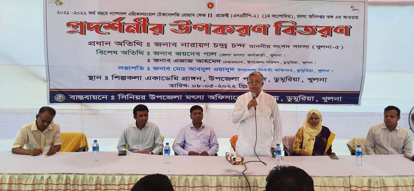 খুলনা ডুমুরিয়ায় উপজেলা সিনিয়র মৎস্য কর্মকর্তা'র আয়োজনে (রবিবার) ৮ই মে সকাল ১০টায়, উপজেলা শিল্পকলা একাডেমি মিলনায়তনে,সহকারী কমিশনার(ভূমি) মামুনুর রশিদের সভাপতিত্বে,এনএটিপি-২ প্রকল্পের অর্থায়নে সিআইজি চাষিদের মাঝে মাছের পোনা ও খাবার বিতরণ করা হয়েছে।