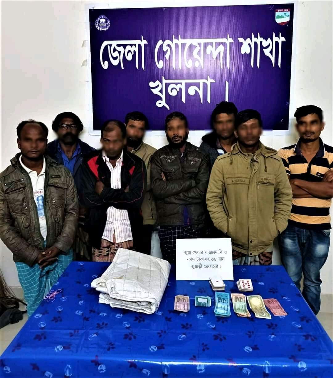 গ্রেফতারকৃতরা হল- ডুমুরিয়ার রুদাঘরা এলাকার গণি বিশ্বাসের ছেলে শরিফুল বিশ্বাস (২৫), মৃত আলী শেখের ছেলে মান্নান শেখ (৩৩), উপানন্দ সরদারের পুত্র দীনেশ সরদার (২৮) ও সমরেশ সরদার (২২), জাহিদুল সরদারের ছেলে বাপ্পী সরদার (২২), পরিমল গাইনের পুত্র উজ্জ্বল গাইন (২৪), মৃত আজিজ সরদারের ছেলে মোঃ বিল্লাল সরদার (৪০), চহেড়া এলাকার মৃত ভবনাথ মন্ডলের পুত্র শ্যামপদ মন্ডল (৫০)। এঘটনায় এস আই (নিঃ) ইন্দ্রজিৎ মল্লিক বাদী হয়ে ডুমুরিয়া থানায় মামলা করেছেন