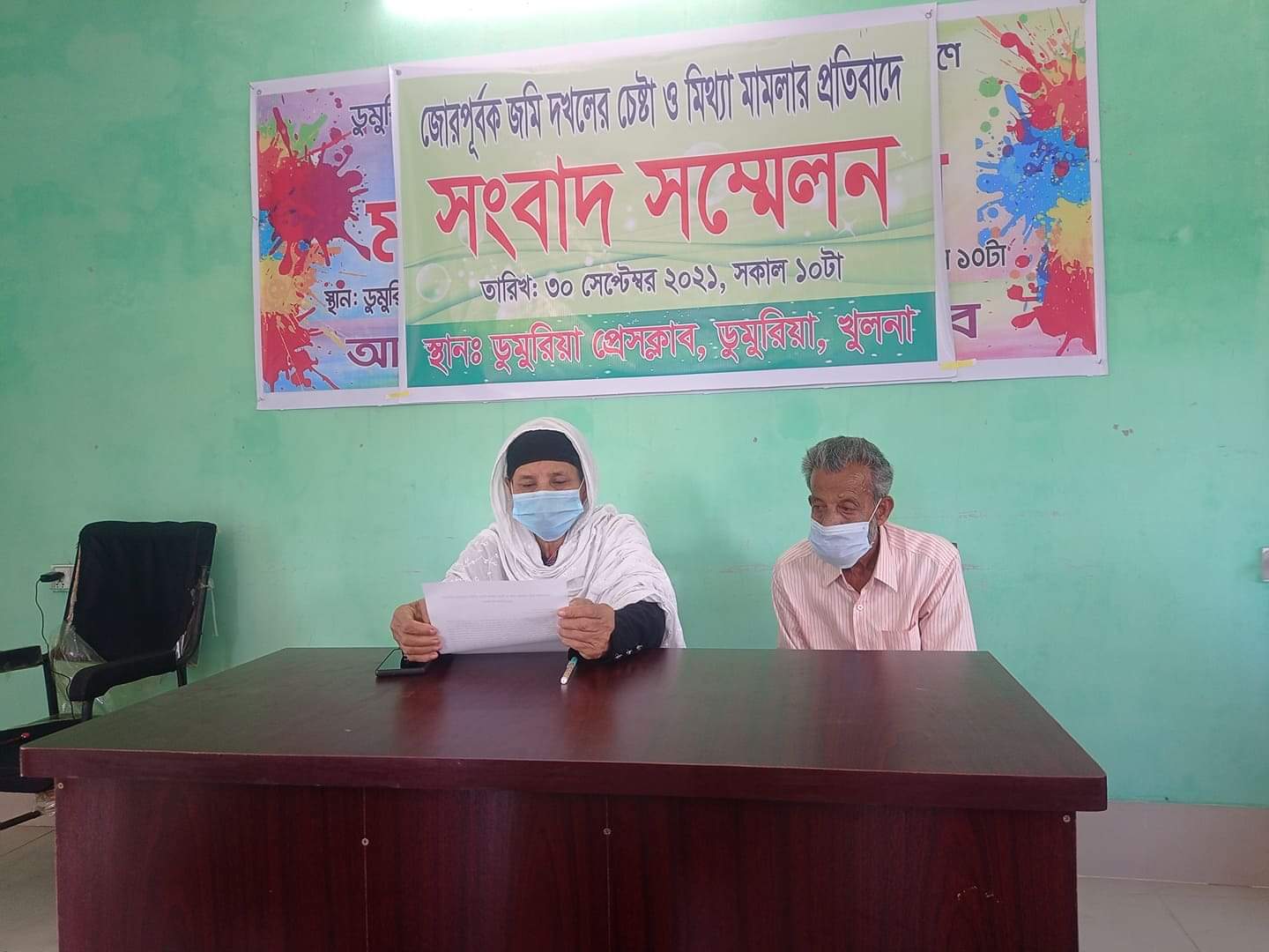 এসময় তিনি লিখিত বক্তব্যে অভিযোগ করে বলেন,আমার স্বামী মুনছুর আলী খান এর পৈতৃক সুত্রে পাওয়া রেকর্ডীয় জমি যার জে এল নং ২৭ এর এস এ খতিয়ান নং- ১৮ দাগ নং- ৪২৫ জমির পরিমান ০.৭৩ একর,বর্তমান আর এস খতিয়ান নং- ১২৬ দাগ নং- ৬০৩ জমির পরিমান ০.৫৮ একর, বর্তমান সন পর্যন্ত জমির খাজনা/ দাখিলা পরিশোধ করে আমরা ভোগদখল করে আসছি। হঠাৎ আমাদের জমির উপর জবরদখল করার চেষ্টা করছে আঙ্গারদহা গ্রামের ভূমিদস্যু আব্দুল হাকিম মোড়লের ছেলে আব্দুর রাজ্জাক মোড়ল,আবুল কালাম মোড়ল,সাত্তার মোড়ল ও আবুল কালাম মোড়লের ছেলে আলী হাসান নয়ন,পিতা আব্দুল হান্নান,মোঃ তুহিন মোড়লসহ তাদের সহযোগীরা।তারা অপশক্তি খাটিয়ে আমাদের রেকর্ডীয় জমি দখলের চেষ্টা করছে। আমি ও আমার পরিবারের উপর নির্যাতন চালায় এবং আমাদের নামে দুইটি মিথ্যা মামলা দায়ের করে পুলিশি হয়রানি করতে থাকে,ডুমুরিয়া থানা মামলা নং ২১ ও ৩০।তারা আমাদের উপর দলবদ্ধভাবে হামলা চালিয়ে বিভিন্ন সময়ে আমাদেরকে জীবন নাশের হুমকি দিয়ে আসছে।আমি ও আমার পরিবার এখন আতংকের ভিতরে দিন পার করছি আমিসহ পরিবারের সদস্যরা নিরাপত্তাহীনতায় ভুগছি,এবং আমরা থানা পুলিশের কোন রকমের সহযোগীতা পাচ্ছি না।ইতিমধ্যে আমি আমার রেকর্ডীয় জমি ঐ সকল ভূমিদস্যুদের হাত থেকে রক্ষা করার জন্য বিজ্ঞ আদালতের দ্বারস্থ হয়ে ১৪৪/১৪৫ ধারায় একটি মামলা দায়ের করেছি,মামলা চলমান রয়েছে।