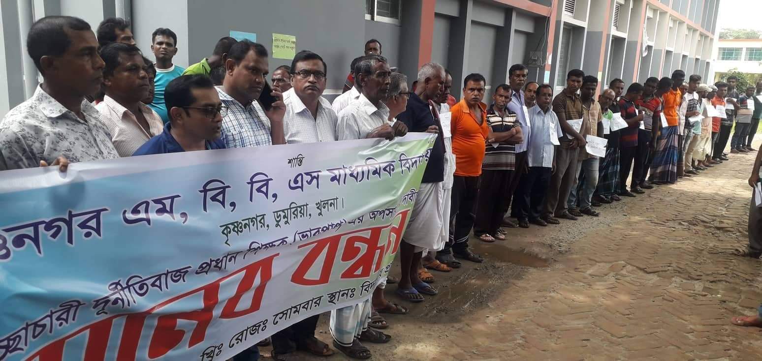 ডুমুরিয়ার কৃষ্ণনগর এম,বি,বি,এস মাধ্যমিক বিদ্যালয়ের ভারপ্রাপ্ত প্রধান শিক্ষক বিচরণ হালদার'র দুর্নীতির বিরুদ্ধে সোমবার সকাল ১০ টায় বিদ্যালেয়ের পাশে সড়কে এক মানববন্ধন করা হয়েছে। মানববন্ধনে বক্তব্যদেন, চেয়ারম্যান মনোজিৎ বালা, সাবেক প্রধান শিক্ষক মৃণাল কান্তি রায়, সমাজ সেবক স্বপন কুমার বিশ্বাস, মেম্বর মিলন কান্তি বালা, অনিল কৃষ্ণ বালা, আনন্দ মোহন বিশ্বাস, নৃপেন মন্ডল, অনাথ ঢালী,অমাল বৈরাগী,পলি রানী মন্ডল, পিংকী রানী মন্ডল প্রমূখ। ওই সময় বক্তারা বলেন, ভারপ্রাপ্ত প্রধান শিক্ষকের নেতৃত্বে ম্যানেজিং কমিটির সভাপতি মধুসূদন বিশ্বাস, সহকারী শিক্ষক মহেশ্বর বৈরাগী ও ললিত মহোন বৈরাগী, বিপুল বৈরাগী বিদ্যালয় আয়াসহ ৩টি পদে লোক নিয়োগের জন্য নকল চিঠি তৈরী করেন। এবং প্রধান শিক্ষক সেইটিকে পুজি করে ৩টি পদে লোক নিয়োগ দিয়ে বিপুল পরিমাণ অর্থ বাণিজ্য করেন। কারো সাথে কোনো আলোচনা না করে এডহক কমিটি করা হয়। প্রধান শিক্ষক পদে নিয়োগ পরীক্ষায় উত্তীর্ণ ব্যক্তির বিরুদ্ধে মিথ্যা মামলা দিয়ে অনেক দিন যাবৎ বিষয়টি ঝুলিয়ে রাখা হয়। তিনি বিদ্যালয় ঠিকমতো আসেন না এমন অভিযোগ তোলা হয়। তিনি ক্লাসের সময় বিভিন্ন ব্যবসা-বাণিজ্য নিয়ে ব্যস্ত থাকেন। অন্যান্য শিক্ষকরা গা ভাসিয়ে ক্লাস নেন। যে কারণে বিদ্যালয়ে শিক্ষার মান খারাপ হয়ে পড়েছে। ফলে শিক্ষার্থী ও অভিভাবকবৃন্দ শিক্ষককের উপর নাখোশ। অভিভাবক ও সুধীজন প্রধান শিক্ষককের অপসারণ চেয়ে তদন্তে সাপেক্ষে সংশ্লিষ্ট উর্ধ্বতন কর্মকর্তার হস্তক্ষেপ কামনা করা হয়।