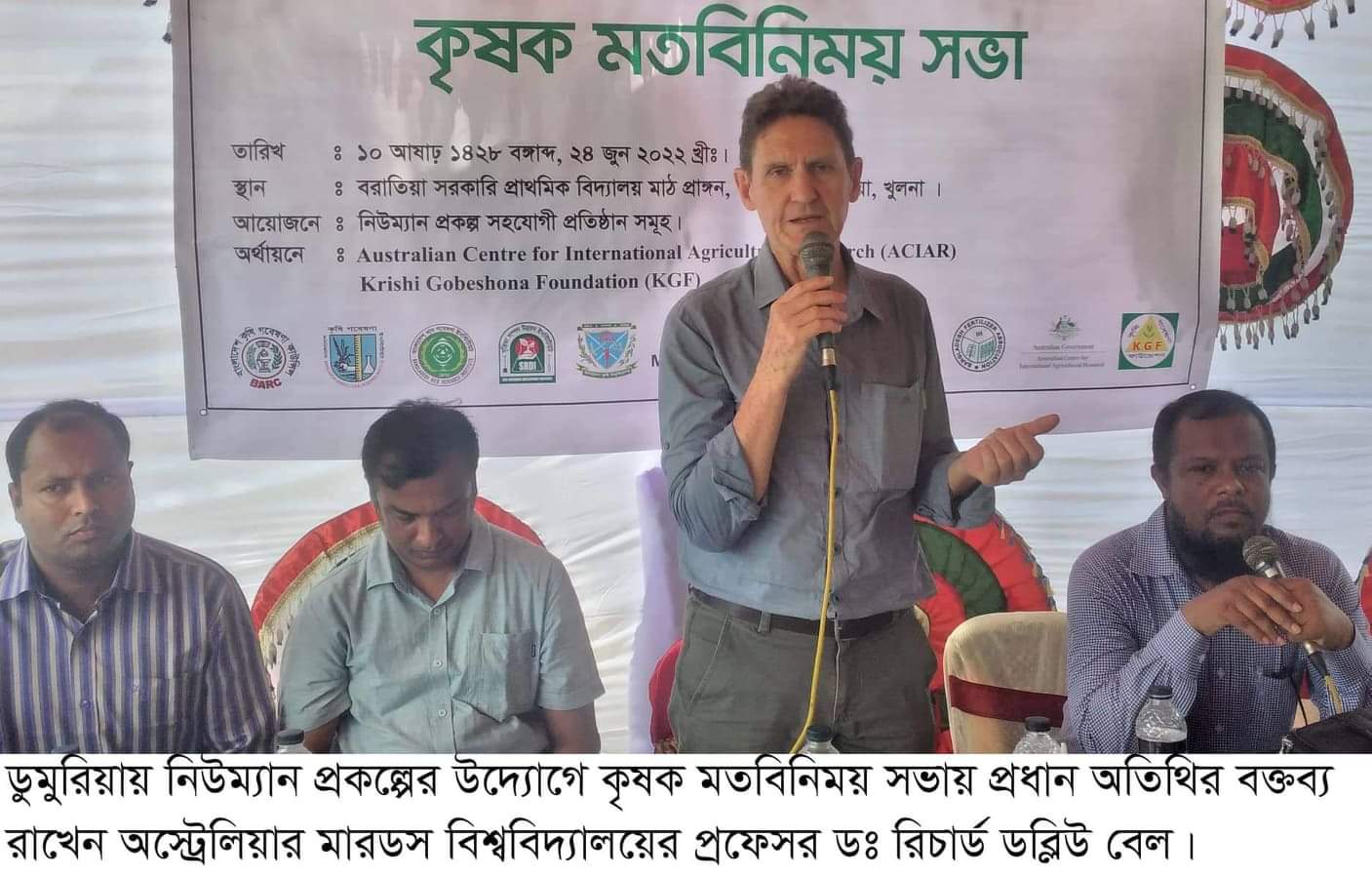 ডুমুরিয়ায় সার সুপারিশমালা কার্ড ব্যবহার ও এর উপকারিতা বিষয়ক এক মতবিনিময় সভা অনুষ্ঠিত হয়েছে। আজ (শুক্রবার ২৪শে জুন) বেলা ১১টায় উপজেলার বরাতিয়া সরকারী প্রাথমিক বিদ্যালয় মাঠে সভাটি অনুষ্ঠিত হয়। নিউম্যান প্রজেক্টের আয়োজনে এবং এসিআইএআর ও কৃষি গবেষণা ফাউন্ডেশন কেজিএফ) এর অর্থায়নে অনুষ্ঠিত এ সভায় সভাপতিত্ব করেন ইউপি সদস্য পলাশ দাস। প্রধান অতিথি হিসেবে উপস্থিত ছিলেন অষ্ট্রেলিয়ার মারডস ইউনিভার্সিটির প্রফেসর ডঃ রিচার্ড ডবিøউ বেল। বিশেষ অতিথি ছিলেন নিউম্যান প্রকল্পের ডেপুটি প্রজেক্ট লিডার ও উক্ত ভার্সিটির এডজাক্ট এসোসিয়েট প্রফেসর ডঃ ইনামুল হক, খুলনা বিশ্ববিদ্যালয়ের প্রফেসর বিধান চন্দ্র সরকার, ডুমুরিয়া উপজেলার উপ সহকারী কৃষি অফিসার প্রকাশ চন্দ্র রায়। বক্তব্য রাখেন প্রকল্পের কর্মকর্তা রেজিয়া বেগম, কৃষক ইসহাক আলী শেখ, আব্দুল হান্নান শেখ, আমিনুল ইসলাম, শাহিদা বেগম, নাজমুল ইসলাম, মোঃ আল আমীন প্রমুখ।
