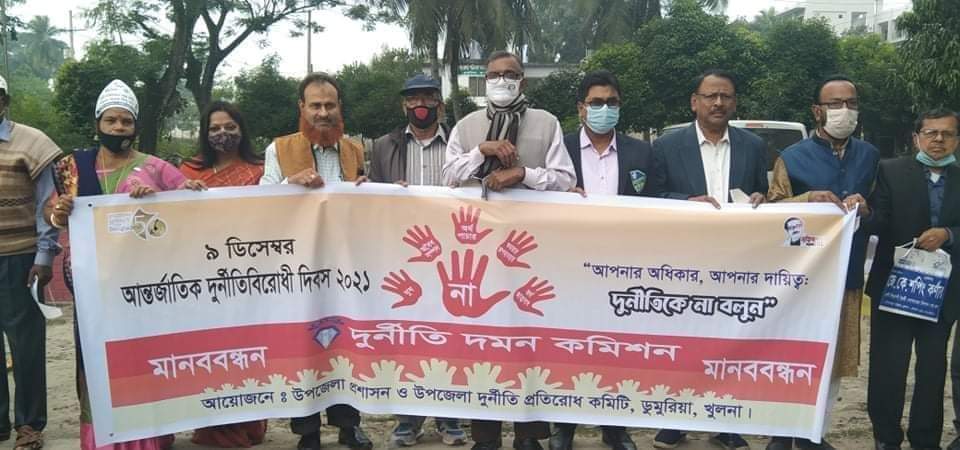 আপনার অধিকার আপনার দায়িত্ব দূর্নীতিকে না বলুন'এবারের এ প্রতিপাদ্যকে সামনে রেখে গত ইং ৯ ডিসেম্বর সকাল ১০ টায় ডুমুরিয়া উপজেলা দূর্নীতি প্রতিরোধ কমিটির উদ্যোগে দূর্নীতি বিরোধী দিবস উদযাপন ২০২১ ইং উপলক্ষে বৃহস্পতিবার উপজেলা পরিষদ চত্বরে এক মানব বন্ধন, র্যালী,আলোচনা সভা অনুষ্ঠিত হয়।