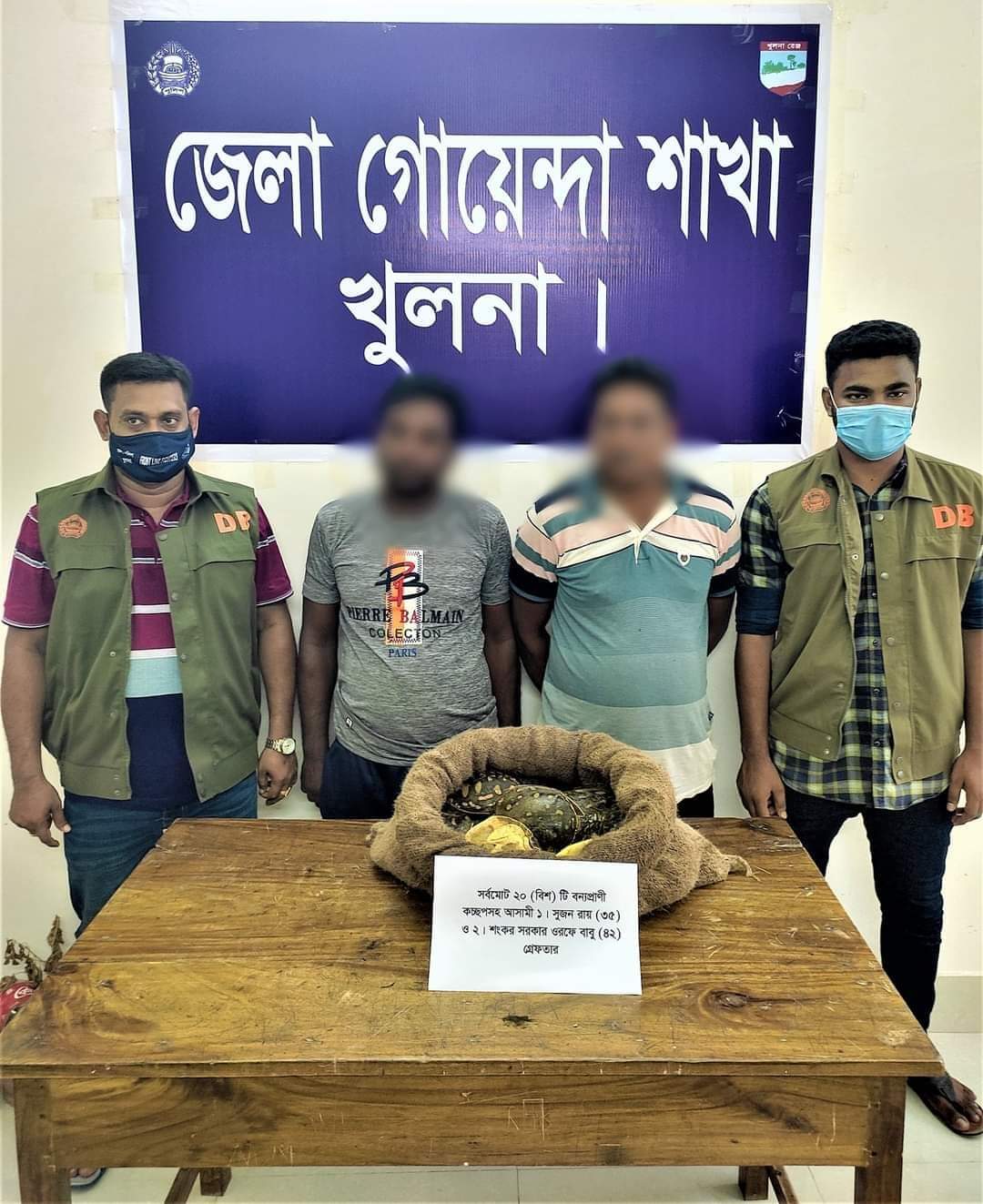 খুলনা জেলা ডিবি পুলিশের বিশেষ অভিযানে ডুমুরিয়া থানা এলাকা হতে ২০ (বিশ) টি বন্যপ্রানী জীবিত কচ্ছপ, যার ওজন অানুমানিক ১৬ (ষোল) কেজি উদ্ধারসহ ০২ (দুই) জন গ্রেফতার।