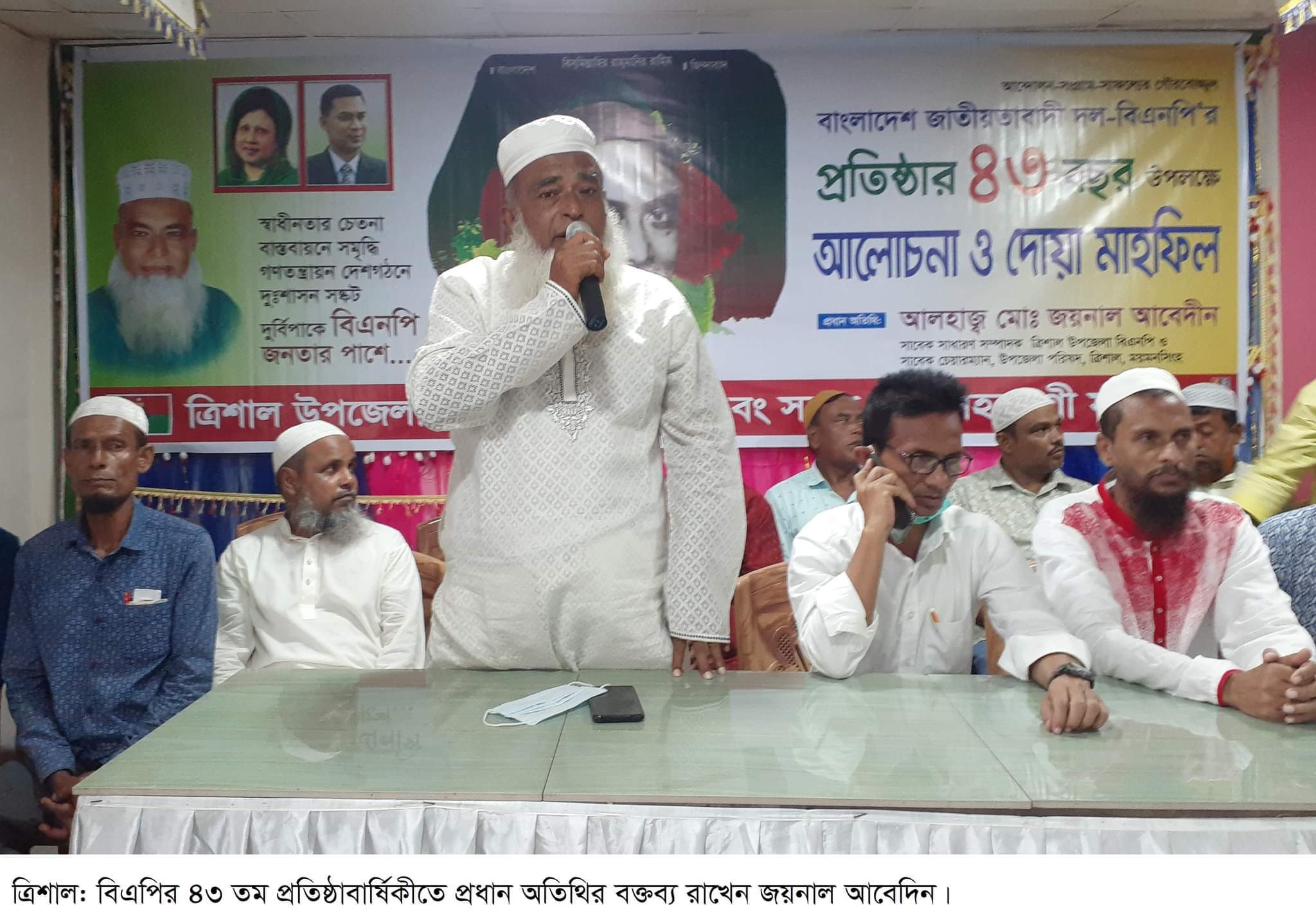 বাংলাদেশ জাতীয়তাবাদী দলের (বিএনপি) ৪৩তম প্রতিষ্ঠাবার্ষিকী উপলক্ষে ময়মনসিংহের ত্রিশালে উপজেলা বিএনপির উদ্যোগে আলোচনা সভা ও দোয়া মাহফিল অনুষ্ঠিত হয়েছে।
