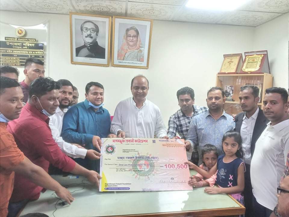 ফেনীর দাগনভূঞায় ক্যান্সার আক্রান্ত হয়ে মৃত্যুবরণকারী মোঃ নজরুল ইসলামের পরিবারের মাঝে প্রবাসীদের মানবিক সংগঠন "দাগনভূঞা প্রবাসী ফাউন্ডেশন" এর উদ্যোগে ১ লাখ ৫শ টাকা অনুদানের চেক হস্তান্তর অনুষ্ঠান বৃহস্পতিবার (২৫ নভেম্বর) দুপুরে দাগনভূঞা উপজেলা পরিষদ চেয়ারম্যানের কার্যালয়ে অনুষ্ঠিত হয়।