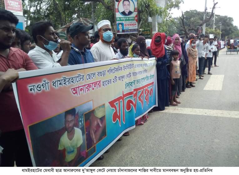 নওগাঁর ধামইরহাটে হাতের দুই আঙ্গুল কাটার নয় দিন পর অবশেষে মুখ খুেলছে আনারুল। বিপুল সংখ্যক মানুষ তার পার্শে দাঁড়ানোর ফলে সকল ভয়ভীতি ও আশংকা উপেক্ষা করে প্রকাশ্যে নিজের হাতের দুই আঙ্গুল কেটে দেয়ার ঘটনা প্রকাশ করেছে। প্রকৃত ঘটনা জানার পর এলাকাবাসী ও শিক্ষার্থীরা ফুঁসে ওঠেছে। বিক্ষোভ সমাবেশ ও মানববন্ধন কর্মসূচীর মাধ্যমে সুষ্টু বিচার দাবী করেছে বিভিন্ন সংগঠন। ঘটনার নয় দিন পর পরিবারের পক্ষ থেকে থানায় মামলা দায়েরের প্রস্তুতি চলছে।