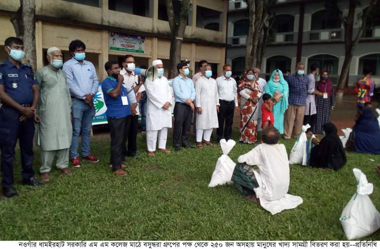 নওগাঁর ধামইরহাটের ২৫০ জন অসহায় পরিবারের মাঝে বসুন্ধরা গ্রুপের খাদ্য সামগ্রী বিতরন করা হয়েছে । করোনা মহামারিতে সম্প্রতি কর্মহীন হয়ে পড়া মানুষের মধ্যে এ সব খাদ্য সামগ্রী বিতরন করা হয়। ৬ আগষ্ট শুক্রবার ধামইরহাট সরকারি এম এম ডিগ্রি কলেজ প্রাঙ্গনে কালের কণ্ঠ শুভ সংঘের সার্বিক সহযোগিতায় বিভিন্ন পেশায় কর্মহীন হয়ে পড়া ২৫০ পরিবারের মাঝে ১০ কেজি চাল, ৩ কেজি ডাল, ৩ কেজি আটা বিতরণ করা হয়। খাদ্য সামগ্রী বিতরনী অনুষ্ঠানে উপস্থিত ছিলেন, উপজেলা চেয়ারম্যান আজাহার আলী মন্ডল, উপজেলা নির্বাহী কর্মকর্তা গনপতি রায়, ধামইরহাট সরকারি এম এম ডিগ্রি কলেজের ভারপ্রাপ্ত অধ্যক্ষ ফরিদুজ্জামান, চকময়রাম সরকারি মডেল উচ্চ বিদ্যালয়ের প্রধান শিক্ষক খেলাল-ই-রব্বানী, উপজেলা আ'লীগের সম্পাদক শহিদুল ইসলাম, কালের কণ্ঠ শুভ সংঘের পরিচালক জাকেরিয়া, কালের কণ্ঠ নওগাঁ জেলা প্রতিনিধি ফরিদুল করিম, সুব সংঘের জয়পুরহাট জেলা প্রতিনিধি আহসান হাবিব, শুভ সংঘের ধামইরহাট উপজেলা সভাপতি আঃ রহিম, সম্পাদক আমজাদ, ধামইরহাট প্রেস ক্লাব সভাপতি আঃ আজিজ, সাবেক সভাপতি বীর মুক্তিযোদ্ধা মোজাম্মেল হক, সাংবাদিক হারুন-আল-রশিদ, এস এম মাসুদুর রহমান, মাসুদ সরকার, সন্তোষ কুমার সাহা প্রমুখ।