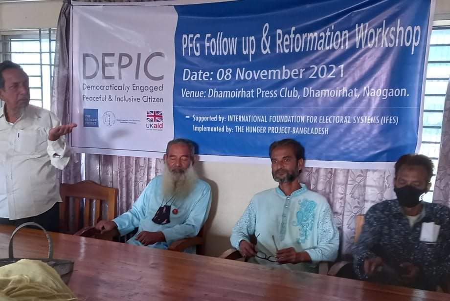 নওগাঁর ধামইরহাটে ডেমোক্রেটিক্যাললি ইনগেজড পিচফুল এন্ড ইনক্লুসিভ সিটিজেন (ডেপিক) এর আয়োজনে গতকাল ৮ নভেম্বর ধামইরহাট প্রেস ক্লাবে বীর মুক্তিযোদ্ধা সাবেক কমান্ডার মোঃ আব্দুর রউফ মন্ডলের সভাপতিত্বে সুজন ও পিএফজির সদস্যদের নিয়ে দিনব্যাপী এক কর্মশালা অনুষ্ঠিত হয়েছে। উক্ত কর্মশালায় নওগাঁ, নাটোর, জয়পুরহাট ও বগুড়া জেলার দায়িত্ব প্রাপ্ত প্রশিক্ষক মোঃ আছির উদ্দিন রাজনৈতিক, সামাজিক ও সহিংসতার উপর আলোচনা করেন। উক্ত কর্মশালায় উপস্থিত ছিলেন, ধামইরহাট প্রেস ক্লাবের সভাপতি আঃ আজিজ মন্ডল, সিনিয়র সহ সভাপতি মুহম্মদ আব্দুল্লাহ হামিদী, সহ সভাপতি সন্তোষ কুমার সাহা, সম্পাদক আবু হেনা মোস্তফা কামাল (বাবু), সাংবাদিক মাসুদ সরকার, মাসুদুর রহমান, বীর মুক্তিযুদ্ধো আহাদ আলী, পিএফজির ধামইরহাটের এ্যাম্বাসিডর ও সাবেক উপজেলা মহিলা ভাইস চেয়ারম্যান মাজেদা বেগম। এছাড়াও বিএনপি, আওয়ামীলীগ এবং জাতীয় পাটির ৩ জন করে সদস্য কর্মশালায় উপস্থিত ছিলেন।