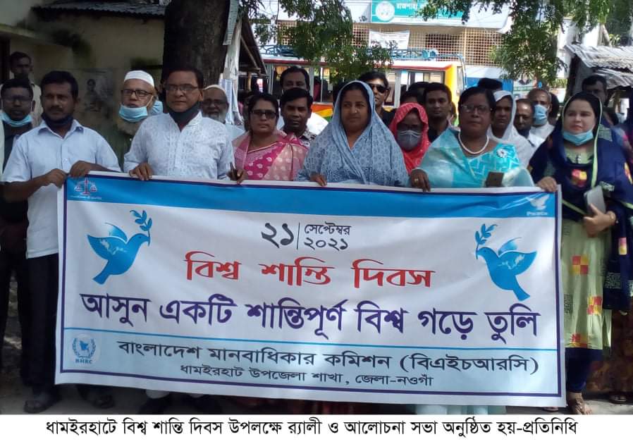 নওগাঁর ধামইরহাটে বাংলাদেশ মানবাধিকার কমিশন (বিএইচআরসি) কর্তৃক বিশ্ব শান্তি দিবস পালিত হয়েছে। এবারের প্রতিপাদ্য "আসুন একটি শান্তিপূর্ণ বিশ্ব গড়ি" এই প্রতিপাদ্যকে সামনে রেখে সারা দেশের ন্যায় দিবসটি উপলক্ষে ধামইরহাট মানবাধিকার কমিশন শাখার উদ্যোগে ২১ সেপ্টেম্বর সকাল ১০ টায় সদরস্থ নিমতলী থেকে একটি র্যালী বের হয়ে উপজেলা পরিষদ প্রদক্ষিন শেষে শান্তির কপোত অবমুক্ত করে উপজেলা পরিষদ অডিটোরিয়াম কক্ষে বাংলাদেশ মানবাধিকার কমিশন, ধামইরহাট শাখার সভাপতি মো. শহীদুল ইসলামের সভাপতিত্বে আলোচনা সভা অনুষ্ঠিত হয়।সভায় প্রধান অতিথী হিসেবে বক্তব্য রাখেন উপজেলা পরিষদের চেয়ারম্যান আলহাজ্ব মো. আজাহার আলী মন্ডল। বিশেষ অতিথি হিসেবে উপস্থিত ছিলেন ধামইরহাট উপজেলা নির্বাহী অফিসার গনপতি রায়, প্রধান আলোচক উপজেলা প্রকৌশলী আলী হোসেন, ধামইরহাট উপজেলা শাখা আওয়ামীলীগের সভাপতি মো. দেলদার হোসেন, উপজেলা ভাইস চেয়ারম্যান সোহেল রানা, অফিসার ইনচার্জ আবদুল মমিন, ধামইরহাট উপজেলা শাখার মানবাধিকার কমিশনের সহ-সভাপতি আব্দুল জলিল, সম্পাদক মেহেদী হাসান, সাংগঠনিক সম্পাদক জাহিদ হাসান, মহিলা আওয়ামীলীগের সভানেত্রী আন্জুয়ারা বেগম, দপ্তর সম্পাদক আবু ইউসুফ মর্তুজা, মহিলা বিষয়ক সম্পাদক মানবতাবাদী তমা আকতার প্রমুখ উপস্থিত ছিলেন।
