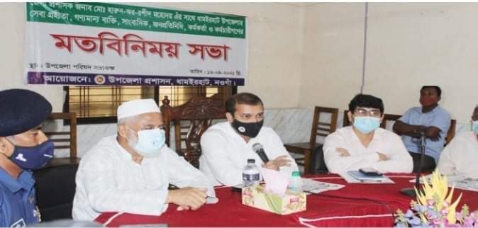 নওগাঁর ধামইরহাট উপজেলার সব শ্রেনীর মানুষের সেবা গ্রহীতা, গন্যমান্য ব্যক্তি, সাংবাদিক, জনপ্রতিনিধিসহ স্থানীয় বিভিন্ন সরকারি দপ্তরের কর্মকর্তা-কর্মচারীগণের সাথে এক মতবিনিময় সভা করেছেন নওগাঁ জেলা প্রশাসক মোঃ হারুন অর রশিদ। বৃহস্পতিবার ১৬ সেপ্টেম্বর দুপুর সাড়ে ১২ টায় ধামইরহাট উপজেলা পরিষদ অডিটোরিয়াম রুমে উপজেলা নির্বাহী অফিসার গনপতি রায়ের সভাপতিত্বে মতবিনিমিয় সভা অনুষ্ঠিত হয়। অনুষ্ঠানে প্রধান অতিথি হিসেবে বক্তব্য রাখেন, নওগাঁ জেলা প্রশাসক মোঃ হারুন অর রশীদ, বক্তবে তিনি বলেন, সীমান্ত এলাকায় মাদক নির্মুল, মাদক ব্যবসায়ী ও মাদক সেবীদের নিয়ন্ত্রনে প্রশাসনকে ভীতিকর পরিস্থিতি সৃষ্টি এবং কঠোর হওয়ার নির্দেশনা দেন। এ সময় ধামইরহাট উপজেলা পরিষদের চেয়ারম্যান আলহাজ্ব আজাহার আলী মন্ডল, উপজেলা আওয়ামীলীগের সভাপতি ও সাবেক উপজেলা চেয়ারম্যান দেলদার হোসেন, সাধারণ সম্পাদক ও ধামইরহাট সরকারী এম এম ডিগ্রী কলেজের সাবেক অধ্যক্ষ মোঃ শহিদুল ইসলাম, ভাইস চেয়ারম্যান সোহেল রানা, ধামইরহাট থানার অফিসার ইনচার্জ আবদুল মমিন, আড়ানগর ইউপি চেয়ারম্যান শাহজাহান আলী +কমল), ইসবপুর ইউপি চেয়ারম্যান ওসমান আলী, ১৪ বিজিবি’র কোম্পানী কমান্ডার প্রমুখ বক্তব্য রাখেন। অনুষ্ঠানে উপজেলার ৮ টি ইউপি চেয়ারম্যান, সরকারী বিভিন্ন পর্যায়ের কর্মকর্তা, রাজনৈতিক ব্যক্তিত্ব, সাংবাদিক নেতৃবৃন্দসহ নানান পর্যায়ের সুধীজন ও সেবা গ্রহীতারা উপস্থিত ছিলেন। ধামইরহাট সমাজসেবা অফিসার সোহেল রানা উপজেলা সম্পর্কে তথ্য পাওয়ার পয়েন্ট প্রেজেন্টেশনের মাধ্যমে উপস্থাপন করেন। তিনি ধামইরহাট থানা ভবন, পৌরসভা ও স্থানীয় স্বাস্থ্য কমপ্লেক্স পরিদর্শন করেন।
