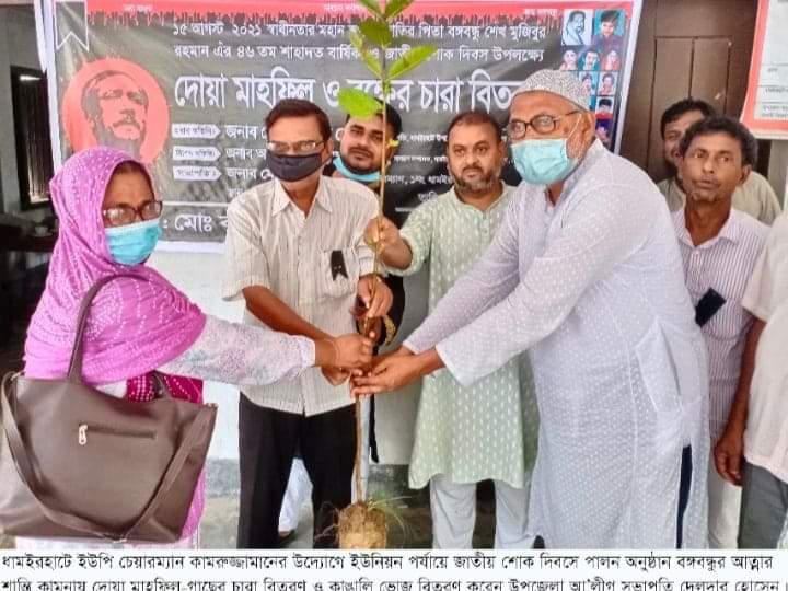 নওগাঁর ধামইরহাটের ১ নম্বর ধামইরহাট ইউনিয়ন পরিষদে যথাযোগ্য মর্যাদায় জাতীয় শোক দিবসে দোয়ার মাহফিল, কাঙ্গালী ভোজ ও গাছের চারা বিতরন করা হয়েছে। সোমবার ১৬ আগস্ট দুপুর ১২ টায় ইউপি চেয়ারম্যান কামরুজ্জামানের উদ্যোগে এবং তাঁর সভাপতিত্বে জাতির পিতা বঙ্গবন্ধু শেখ মুজিবুর রহমানের ৪৬ তম শাহাদাত বার্ষিকী ও জাতীয় শোক দিবস উপলক্ষে উপরোক্ত আয়োজন করা হয়। এ সময় বঙ্গবন্ধু ও তার পরিবারের সকল সদস্যের আত্নার মাগফেরাত কামনা করে দোয়া মাহফিল পরিচালনা করেন হাফেজ মাওলানা শরিফুল ইসলাম। দোয়া শেষে ৫ শতাধিক মানুষের কাঙালি ভোজ ও ২ শতাধিক ফলজ গাছের চারা বিতরণ করেন অনুষ্ঠানের প্রধান অতিথি উপজেলা পরিষদের সাবেক চেয়ারম্যান ও উপজেলা আওয়ামীলীগ সভাপতি মো. দেলদার হোসেন। অনুষ্ঠানে উপজেলা আওয়ামীলীগের সাধারণ সম্পাদক ও ধামইরহাট সরকারি এম এম ডিগ্রি কলেজের সাবেক অধ্যক্ষ মো. শহিদুল ইসলাম, ইউপি সদস্য এনামুল হক, জাকারিয়া হোসেন, মিজানুর রহমান, কামাল চৌধুরী, নারী সদস্য রেহেনা বানু, রেবেকা পারভীন, ওয়ার্ড আওয়ামীলীগ সভাপতি রফিকুল আতিক কনক, উপজেলা ছাত্রলীগ সভাপতি আবু সুফিয়ান হোসাইন প্রমুখ উপস্থিত ছিলেন।