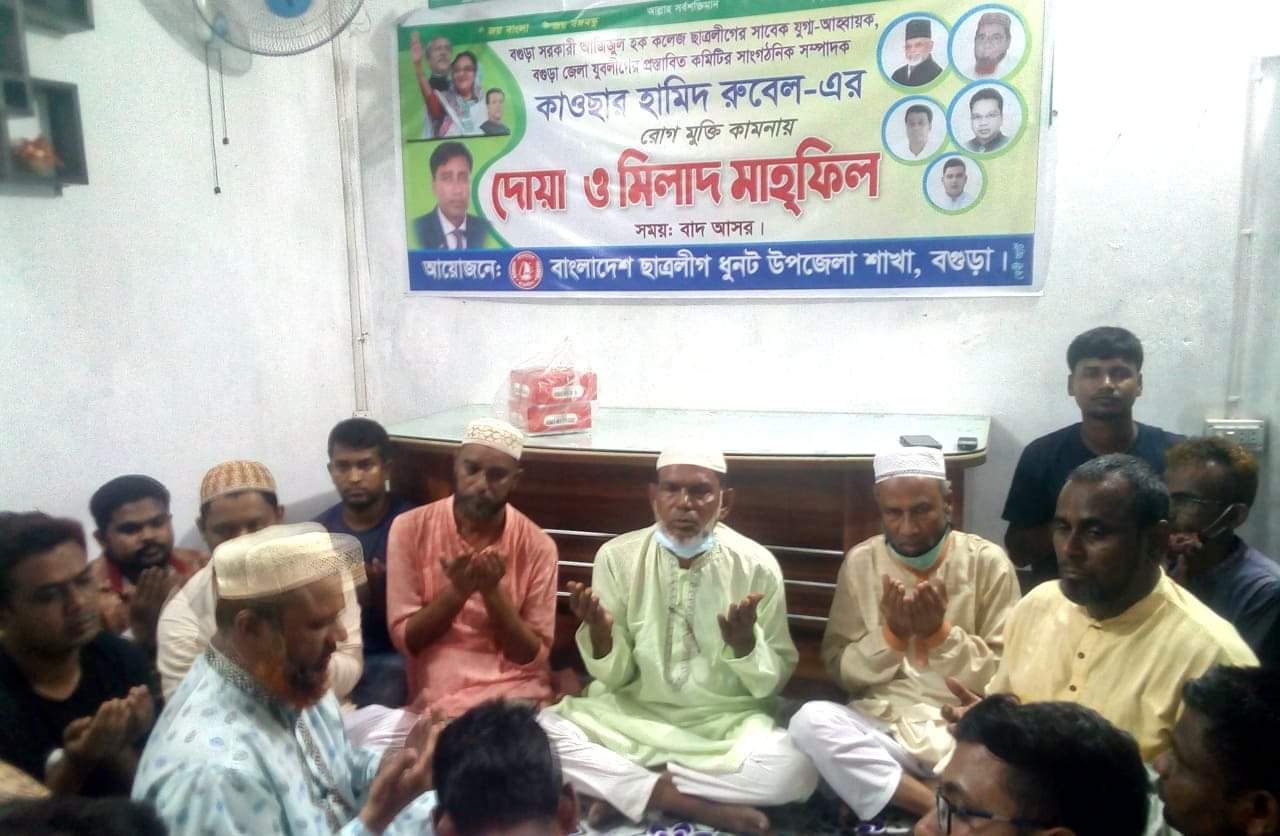 সরকারি আজিজুল হক কলেজ ছাত্রলীগের সাবেক যুগ্ম আহ্বায়ক ও জেলা যুবলীগের প্রস্তাবিত কমিটির সাংগঠনিক সম্পাদক কাওছার হামিদ রুবেলের রোগ মুক্তি কামনায় বগুড়ার ধুনটে দোআ ও মিলাদ মাহফিল অনুষ্ঠিত হয়েছে। উপজেলা ছাত্রলীগের অায়োজনে রবিবার বাদ আছর হুকুমআলী এলাকায় ছাত্রলীগের দলীয় কার্যালয়ে এ দোআ ও মিলাদ মাহফিল অনুষ্ঠিত হয়।